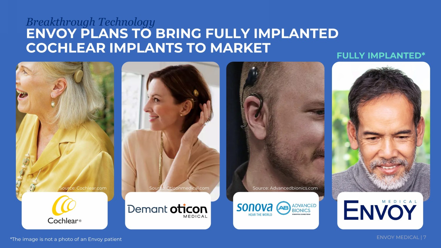 ENVOY MEDICAL | 6 ~2.8 M U.S. ADULTS SUFFER MODERATE TO PROFOUND HEARING LOSS AND MAY BE CANDIDATES FOR COCHLEAR IMPLANTS 1 ~$84B and growing untapped potential cochlear implant U.S. market opportunity 3,4 Sources: (1) Goman , Adele M., and Frank R. Lin. "Prevalence of hearing loss by severity in the United States." American journal of public healt h 1 06.10 (2016): 1820 - 1822.; Goman , Adele M., Nicholas S. Reed, and Frank R. Lin. "Addressing estimated hearing loss in adults in 2060." JAMA Otolaryngology – Head & Neck Surge ry 143.7 (2017): 733 - 734 (2) Cochlear Limited Annual Report 2022 (3) S2N Market Model prepared for Envoy Medical Corporation (4) Assumes device price of ~$30,000 for 2.8M U.S. population of potential candidates for cochlear implants Less than ~ 5% of the people that could benefit from an implantable hearing solution have received one 2