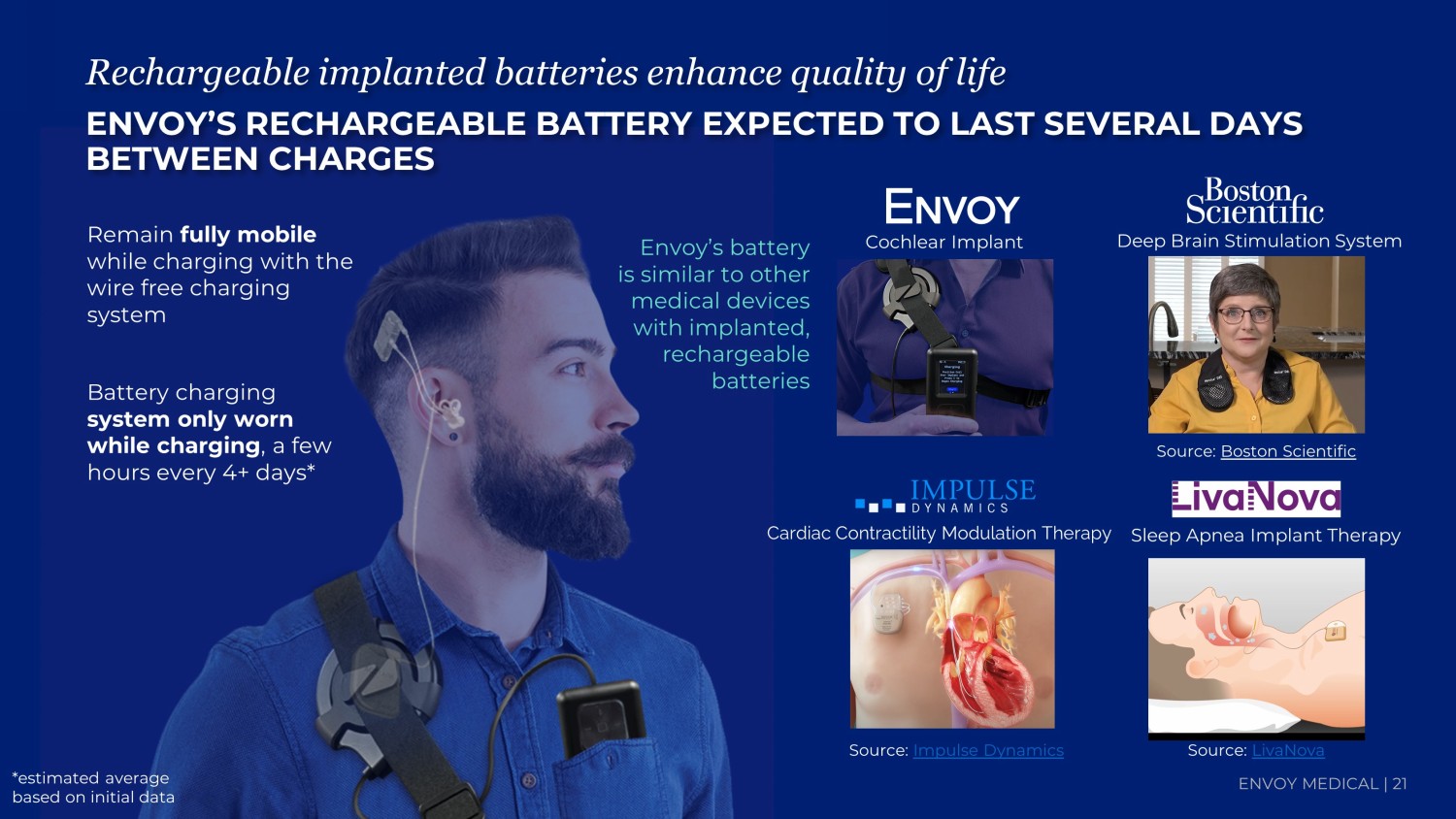 ENVOY MEDICAL | 20 COMPANY & PRODUCT OVERVIEW Executive Summary Who Are We? Envoy Medical Corporation is a hearing health company focused on providing innovative technologies and solutions across the hearing loss spectrum. Our technologies are designed to shift the hearing industry paradigm and bring both providers and patients the fully implanted hearing devices they desire. Our products are designed to deliver: x Improved hearing x Improved quality of life x Reduction to healthcare costs over time x Dignity and independence Envoy Medical Corporation is dedicated to innovating and pushing hearing technology beyond the status quo to improve access, usability, compliance and ultimately quality of life. Acclaim ® A fully implanted cochlear implant (“FICI”), granted Breakthrough Device Designation by the FDA . The Acclaim represents a long - anticipated shift from partially implanted cochlear implants. The device leverages the natural anatomy of the ear rather than utilizing a microphone to capture sound. Sound vibrations enter through the ear and are processed into customized electronic signals. Envoy’s stimulator sends these electrical signals to the cochlea and hearing nerve resulting in the sensation of sound. Esteem ® The Esteem® is the first and only currently FDA - approved, fully - implanted active middle ear implant (AMEI) . The Envoy Sensor converts the vibrations into electrical signals that are sent to the implanted Esteem Sound Processor . The Esteem Sound Processor receives, adjusts and intensifies the signals . The Esteem Driver directly transfers these signals to the inner ear where the hair cells are stimulated, causing you to hear . ~ 1 , 000 Esteems have been installed . Shared sensor technology for both products. Esteem sensor has been implanted in patients for over fifteen years.