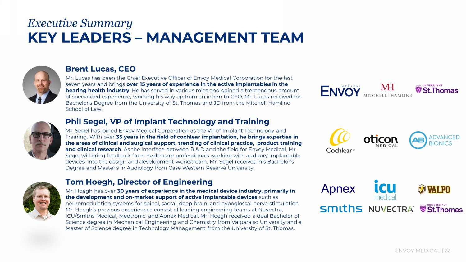 ENVOY MEDICAL | 22 KEY LEADERS – MANAGEMENT TEAM Executive Summary Brent Lucas, CEO Mr. Lucas has been the Chief Executive Officer of Envoy Medical Corporation for the last seven years and brings over 15 years of experience in the active implantables in the hearing health industry . He has served in various roles and gained a tremendous amount of specialized experience, working his way up from an intern to CEO. Mr. Lucas received his Bachelor’s Degree from the University of St. Thomas and JD from the Mitchell Hamline School of Law. Phil Segel , VP of Implant Technology and Training Mr. Segel has joined Envoy Medical Corporation as the VP of Implant Technology and Training. With over 35 years in the field of cochlear implantation, he brings expertise in the areas of clinical and surgical support, trending of clinical practice, product training and clinical research . As the interface between R & D and the field for Envoy Medical, M r. Segel will bring feedback from healthcare professionals working with auditory implantable devices, into the design and development workstream. Mr. Segel received his Bachelor’s Degree and Masters in Audiology from Case Western Reserve University. Tom Hoegh , Director of Engineering Mr. Hoegh has over 25 years of experience in the medical device industry, primarily in the development and on - market support of active implantable devices such as neuromodulation systems for spinal, sacral, deep brain, and hypoglossal nerve stimulation. Mr. Hoegh’s previous experiences consist of leading engineering teams at Nuvectra , ICU/Smiths Medical, Medtronic, and Apnex Medical. Mr. Hoegh received a dual Bachelor of Science degree in Mechanical Engineering and Chemistry from Valparaiso University and a Master of Science degree in Technology Management from the University of St. Thomas.