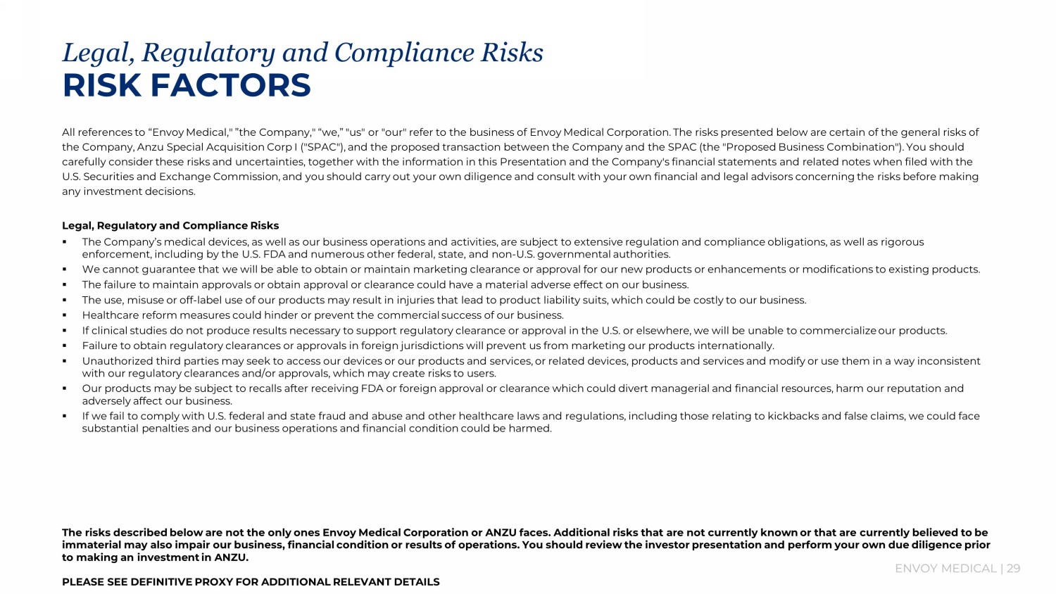 ENVOY MEDICAL | 32 General Business Risks ▪ Downturns or volatility in general economic conditions could have a material adverse effect on the Company's business, financ ial condition, results of operations and liquidity. ▪ The Company's competitive position could be adversely affected if it is unable to meet customers' requirements or expectation s. ▪ If the Company is unable to expand or further diversify its customer base, its business, financial condition, and results of ope rations could suffer. ▪ If the Company's products do not conform to, or are not compatible with, existing or emerging industry standards, demand for its products may decrease or never materialize, which in turn would harm the Company's business and operating results. ▪ The Company is subject to risks and uncertainties associated with international operations, which may harm its business. ▪ If the Company cannot maintain its culture as it grows, its business could be harmed. ▪ The Company may not be able to effectively manage its growth and may need to incur significant expenditures to address the ad dit ional operational and control requirements of its growth, either of which could harm the Company's business and operating results. ▪ The Company may from time - to - time desire to exit certain programs or businesses, or to restructure its operations, but may not b e successful in doing so. ▪ The Company may pursue mergers, acquisitions, investments and joint ventures, which could divert its management's attention o r o therwise disrupt its operations and adversely affect its results of operations. ▪ The Company may not manage its growth effectively. ▪ Our forecasts and projections are based on assumptions, analyses and internal estimates developed by our management. If these as sumptions, analyses or estimates prove to be incorrect or inaccurate, our actual operating results may differ materially from those forecasted or projected. ▪ The market adoption of our products is evolving and may develop more slowly or differently than we expect. Our future success de pends on the growth and expansion of these markets and our ability to adapt and respond effectively to evolving markets. ▪ If we fail to retain or attract key opinion leaders and clinical research partners for any reason, even if unrelated to our b usi ness, it could negatively impact our reputation and ability to grow our business. ▪ Interruption or failure of our information technology and communication systems could impact our ability to effectively provi de our products and services. We are subject to cybersecurity risks to operational systems, security systems, infrastructure, integrated software in our products and custome r d ata processed by us or third - party vendors or suppliers and any material failure, weakness, interruption, cyber event, incident or breach of security could hinder the effe cti ve operation of our business. RISK FACTORS Business, Commercial & Financial Risks - Continued The risks described below are not the only ones Envoy Medical Corporation or ANZU faces. Additional risks that are not curren tly known or that are currently believed to be immaterial may also impair our business, financial condition or results of operations. You should review the investor presentation and perform your own due dil igence prior to making an investment in ANZU. PLEASE SEE DEFINITIVE PROXY FOR ADDITIONAL RELEVANT DETAILS
