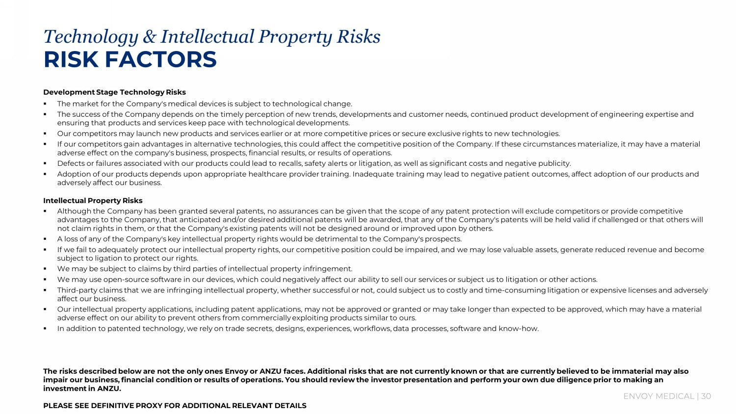 ENVOY MEDICAL | 30 Development Stage Technology Risks ▪ The market for the Company's medical devices is subject to technological change. ▪ The success of the Company depends on the timely perception of new trends, developments and customer needs, continued product de velopment of engineering expertise and ensuring that products and services keep pace with technological developments. ▪ Our competitors may launch new products and services earlier or at more competitive prices or secure exclusive rights to new tec hnologies. ▪ If our competitors gain advantages in alternative technologies, this could affect the competitive position of the Company. If th ese circumstances materialize, it may have a material adverse effect on the company's business, prospects, financial results, or results of operations. ▪ Defects or failures associated with our products could lead to recalls, safety alerts or litigation, as well as significant c ost s and negative publicity. ▪ Adoption of our products depends upon appropriate healthcare provider training. Inadequate training may lead to negative pati ent outcomes, affect adoption of our products and adversely affect our business. Intellectual Property Risks ▪ Although the Company has been granted several patents, no assurances can be given that the scope of any patent protection wil l e xclude competitors or provide competitive advantages to the Company, that anticipated and/or desired additional patents will be awarded, that any of the Company's pate nts will be held valid if challenged or that others will not claim rights in them, or that the Company's existing patents will not be designed around or improved upon by others. ▪ A loss of any of the Company's key intellectual property rights would be detrimental to the Company's prospects. ▪ If we fail to adequately protect our intellectual property rights, our competitive position could be impaired, and we may los e v aluable assets, generate reduced revenue and become subject to ligation to protect our rights. ▪ We may be subject to claims by third parties of intellectual property infringement. ▪ We may use open - source software in our devices, which could negatively affect our ability to sell our services or subject us to litigation or other actions. ▪ Third - party claims that we are infringing intellectual property, whether successful or not, could subject us to costly and time - consuming litigation or expensive licenses and adversely affect our business. ▪ Our intellectual property applications, including patent applications, may not be approved or granted or may take longer than ex pected to be approved, which may have a material adverse effect on our ability to prevent others from commercially exploiting products similar to ours. ▪ In addition to patented technology, we rely on trade secrets, designs, experiences, workflows, data processes, software and k now - how. RISK FACTORS Technology & Intellectual Property Risks The risks described below are not the only ones Envoy or ANZU faces. Additional risks that are not currently known or that ar e c urrently believed to be immaterial may also impair our business, financial condition or results of operations. You should review the investor presentation and perform your own due dil igence prior to making an investment in ANZU. PLEASE SEE DEFINITIVE PROXY FOR ADDITIONAL RELEVANT DETAILS