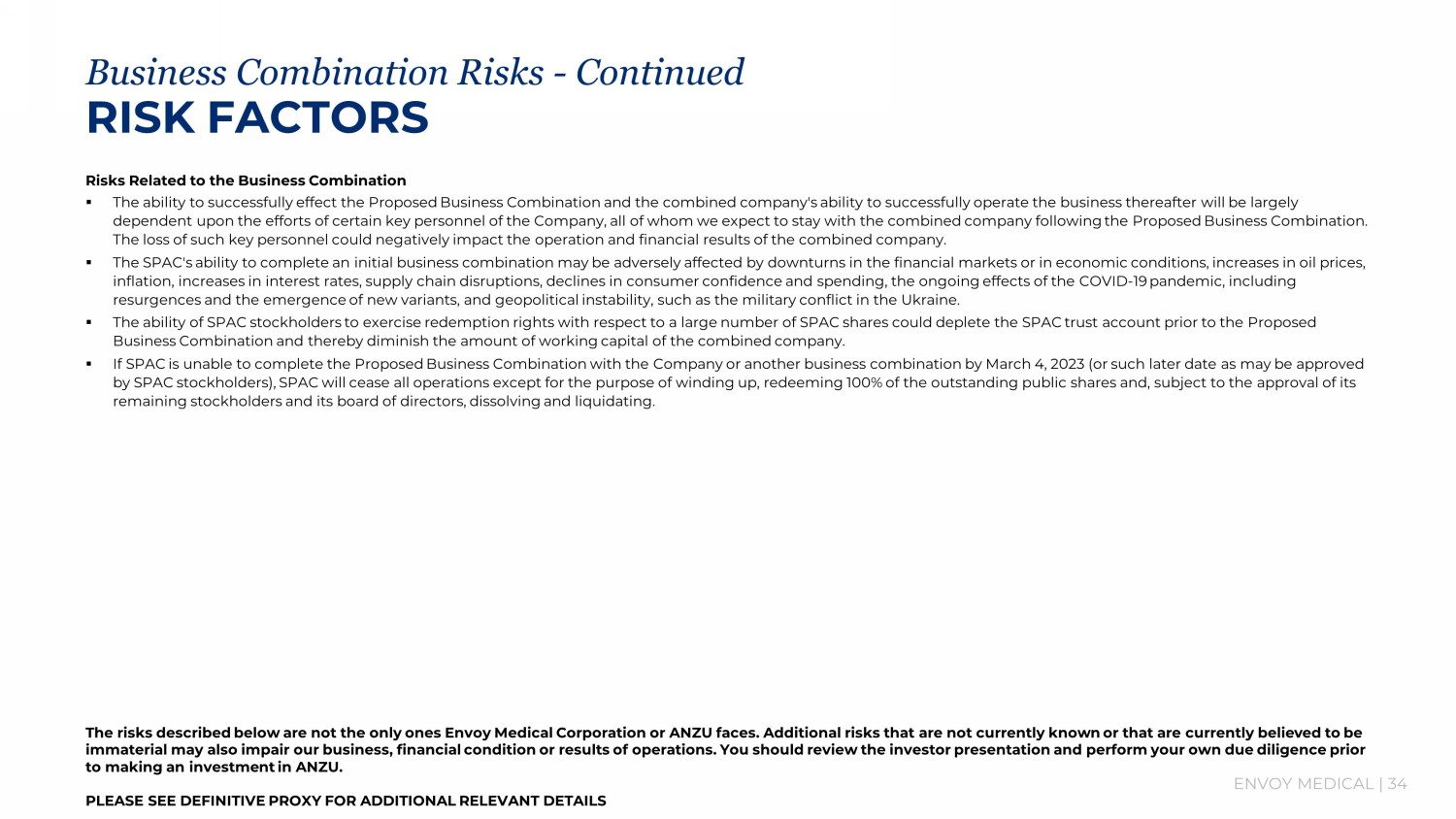 ENVOY MEDICAL | 33 Risks Related to the Business Combination ▪ Events, changes or other circumstances, many of which are beyond the control of the Company and SPAC, could give rise to the ter mination of negotiations and any subsequent definitive agreements with respect to the Proposed Business Combination. ▪ The Proposed Business Combination may disrupt current plans and operations of the Company. ▪ If the Proposed Business Combination's benefits do not meet expectations of investor or securities analysts, the market price of the SPAC's securities, or following the consummation of the Proposed Business Combination, the combined company's securities, may decline. ▪ The valuation ascribed to the combined company may not be indicative of the price that will prevail in the trading market fol low ing the Prosed Business Combination. If an active market for the combined company's securities develops and continues, the trading price of the combined company's secur iti es following the Proposed Business Combination could be volatile and subject to wide fluctuations in response to various factors, which could contribute to the los s of all or part of your investment. ▪ Both the SPAC and the Company will incur significant transactions costs in connection with the Proposed Business Combination. ▪ The SPAC and the Company may not successfully or timely consummate the Proposed Business Combination, including the risk that an y required regulatory approvals are not obtained, are delayed or are subject to unanticipated conditions that could adversely affect the combined company or the expe cte d benefits of the Proposed Business Combination or that the approval of the stockholders of the SPAC is not obtained. ▪ The consummation of the Proposed Business Combination is subject to a number of conditions and if those conditions are not sa tis fied or waived, the Proposed Business Combination agreement may be terminated in accordance with its terms and the Proposed Business Combination may not be complet ed. ▪ Since the SPAC Sponsor has interests that are different, or in addition to (and which may conflict with), the interests of th e S PAC public stockholders, a conflict of interest may exist in determining whether the Proposed Business Combination is appropriate as a business combination. Such interests inclu de that the SPAC Sponsor will lose its entire investment in the SPAC if a business combination is not completed. ▪ There is no guarantee that a stockholder's decision whether to redeem its shares for a pro rata portion for the trust account wi ll put the stockholder in a better future economic position. ▪ Legal proceedings in connection with the Proposed Business Combination, the outcomes of which are uncertain, could delay or p rev ent the completion of the Proposed Business Combination. ▪ Following the consummation of the Proposed Business Combination, the combined company will incur significant increased expens es and administrative burdens as a public company, which could have an adverse effect on its business, financial condition and results of operation. ▪ Changes in laws or regulations, or a failure to comply with any laws and regulations, may adversely affect the Company's or t he combined company's business, including the ability of the parties to consummate the Proposed Business Combination, and results of operation of the Company or the combin ed company. RISK FACTORS Business Combination Risks The risks described below are not the only ones Envoy Medical Corporation or ANZU faces. Additional risks that are not curren tly known or that are currently believed to be immaterial may also impair our business, financial condition or results of operations. You should review the investor presentation and perform your own due dil igence prior to making an investment in ANZU. PLEASE SEE DEFINITIVE PROXY FOR ADDITIONAL RELEVANT DETAILS
