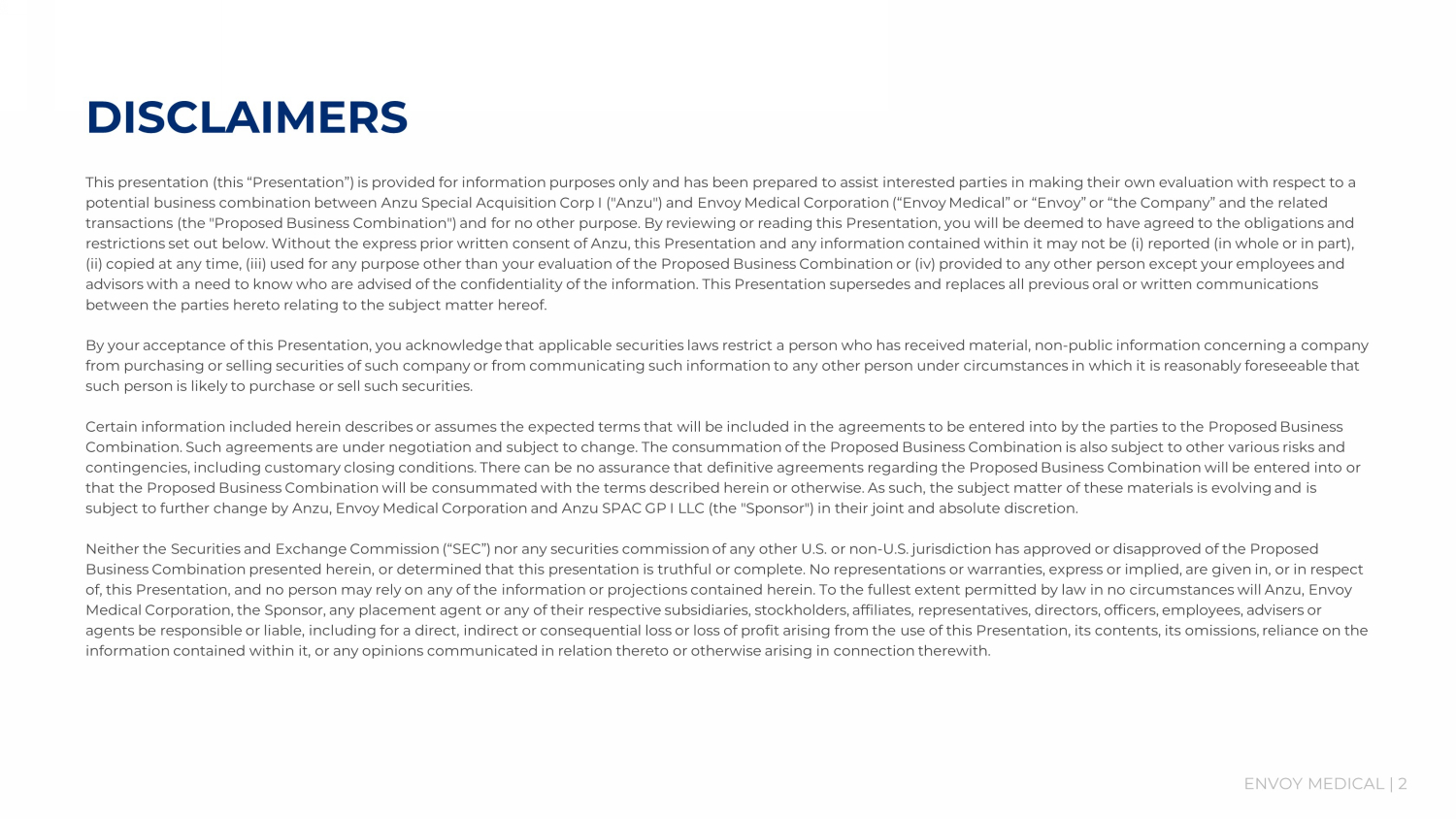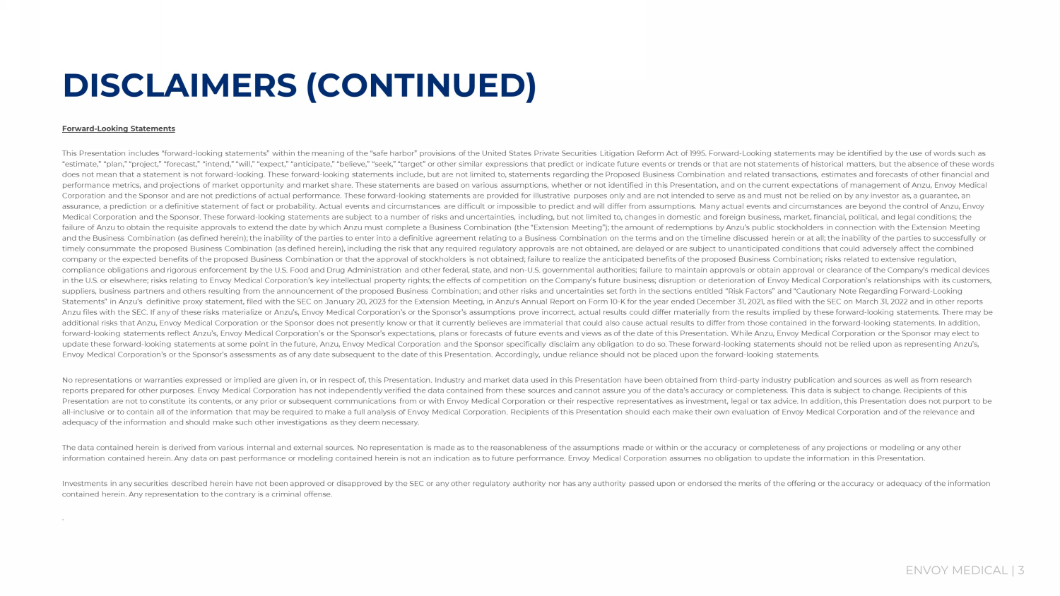 ENVOY MEDICAL | 2 This presentation (this “Presentation”) is provided for information purposes only and has been prepared to assist interested par ties in making their own evaluation with respect to a potential business combination between Anzu Special Acquisition Corp I (" Anzu ") and Envoy Medical Corporation (“Envoy Medical” or “Envoy” or “the Company” and the related transactions (the "Proposed Business Combination") and for no other purpose. By reviewing or reading this Presentation, you w ill be deemed to have agreed to the obligations and restrictions set out below. Without the express prior written consent of Anzu , this Presentation and any information contained within it may not be ( i ) reported (in whole or in part), (ii) copied at any time, (iii) used for any purpose other than your evaluation of the Proposed Business Combination or (iv) p rov ided to any other person except your employees and advisors with a need to know who are advised of the confidentiality of the information. This Presentation supersedes and repl ace s all previous oral or written communications between the parties hereto relating to the subject matter hereof. By your acceptance of this Presentation, you acknowledge that applicable securities laws restrict a person who has received m ate rial, non - public information concerning a company from purchasing or selling securities of such company or from communicating such information to any other person under circum sta nces in which it is reasonably foreseeable that such person is likely to purchase or sell such securities. Certain information included herein describes or assumes the expected terms that will be included in the agreements to be ent ere d into by the parties to the Proposed Business Combination. Such agreements are under negotiation and subject to change. The consummation of the Proposed Business Combinati on is also subject to other various risks and contingencies, including customary closing conditions. There can be no assurance that definitive agreements regarding the Pro pos ed Business Combination will be entered into or that the Proposed Business Combination will be consummated with the terms described herein or otherwise. As such, the subject ma tter of these materials is evolving and is subject to further change by Anzu , Envoy Medical Corporation and Anzu SPAC GP I LLC (the "Sponsor") in their joint and absolute discretion. Neither the Securities and Exchange Commission (“SEC”) nor any securities commission of any other U.S. or non - U.S. jurisdiction has approved or disapproved of the Proposed Business Combination presented herein, or determined that this presentation is truthful or complete. No representations or wa rra nties, express or implied, are given in, or in respect of, this Presentation, and no person may rely on any of the information or projections contained herein. To the fullest exten t p ermitted by law in no circumstances will Anzu , Envoy Medical Corporation, the Sponsor, any placement agent or any of their respective subsidiaries, stockholders, affiliates, repr ese ntatives, directors, officers, employees, advisers or agents be responsible or liable, including for a direct, indirect or consequential loss or loss of profit arising from the us e o f this Presentation, its contents, its omissions, reliance on the information contained within it, or any opinions communicated in relation thereto or otherwise arising in connection therewit h. DISCLAIMERS