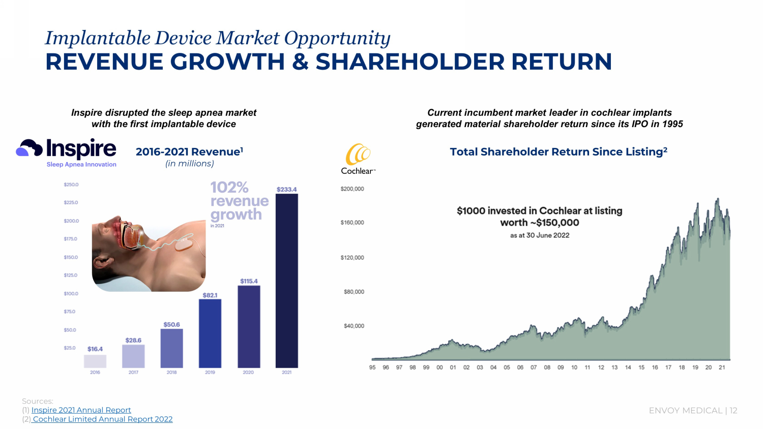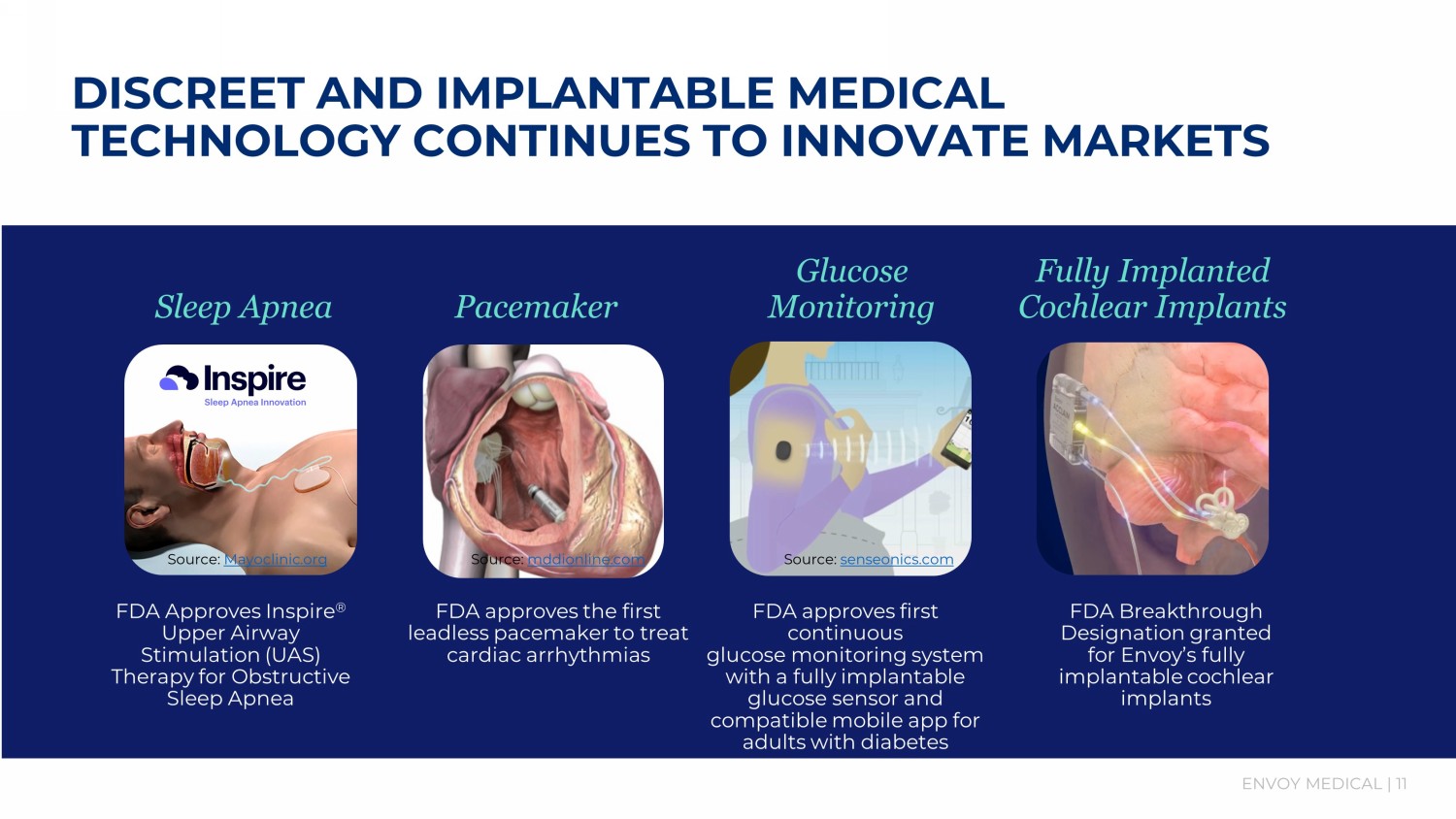 ENVOY MEDICAL | 11 DISCREET AND IMPLANTABLE MEDICAL TECHNOLOGY CONTINUES TO INNOVATE MARKETS Sleep Apnea Fully Implanted Cochlear Implants Glucose Monitoring Pacemaker FDA Approves Inspire ® Upper Airway Stimulation (UAS) Therapy for Obstructive Sleep Apnea ( video ) FDA Breakthrough Designation granted for Envoy’s fully implantable cochlear implants FDA approves first continuous glucose monitoring system with a fully implantable glucose sensor and compatible mobile app for adults with diabetes FDA approves the first leadless pacemaker to treat cardiac arrhythmias Source: Mayoclinic.org Source: senseonics.com Source: mddionline.com
