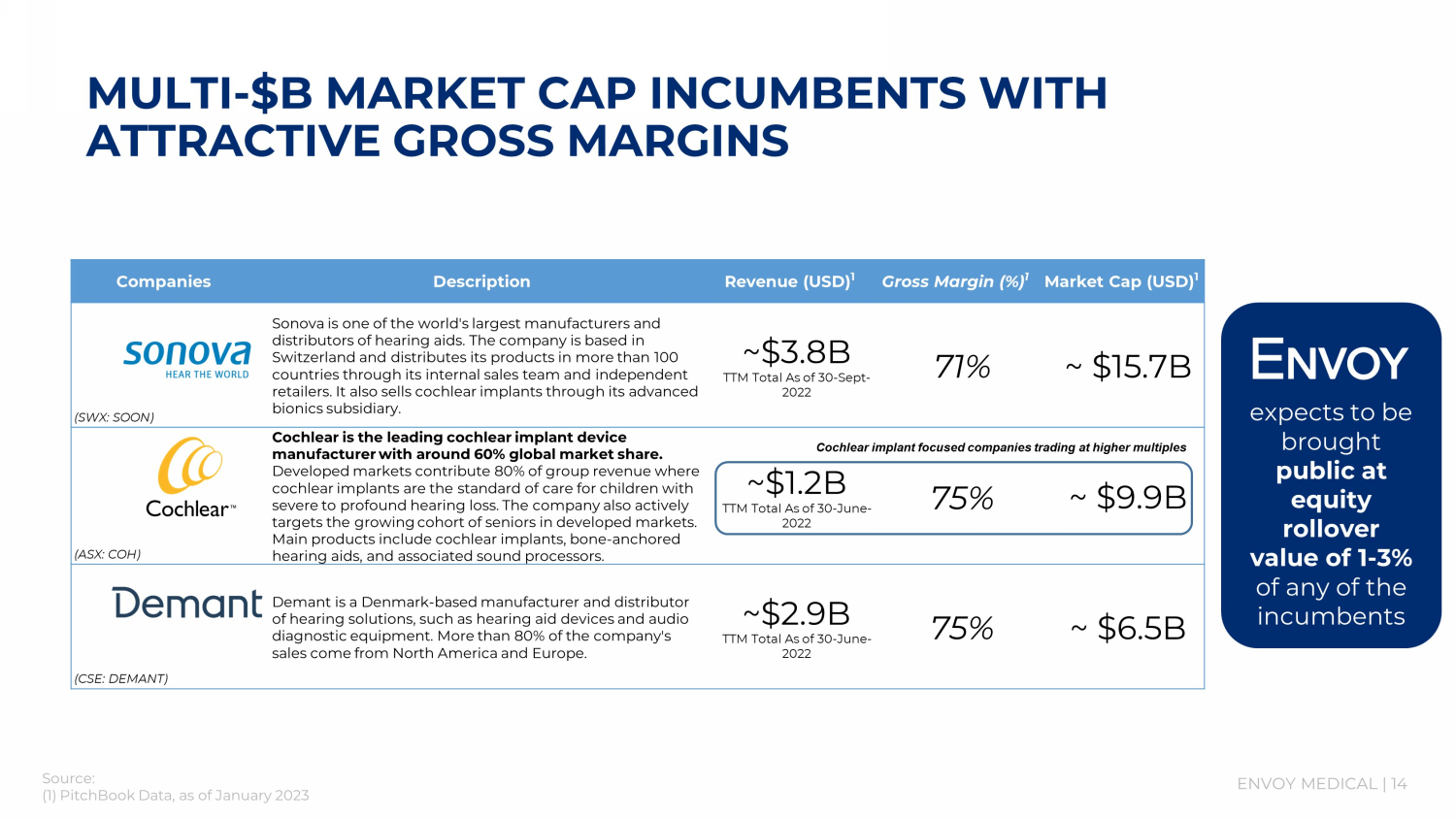 ENVOY MEDICAL | 14 Companies Description Revenue (USD) 1 Gross Margin (%) 1 Market Cap (USD) 1 (SWX: SOON) Sonova is one of the world's largest manufacturers and distributors of hearing aids. The company is based in Switzerland and distributes its products in more than 100 countries through its internal sales team and independent retailers. It also sells cochlear implants through its advanced bionics subsidiary. ~$3.8B TTM Total As of 30 - Sept - 2022 71% ~ $15.7B (ASX: COH) Cochlear is the leading cochlear implant device manufacturer with around 60% global market share. Developed markets contribute 80% of group revenue where cochlear implants are the standard of care for children with severe to profound hearing loss. The company also actively targets the growing cohort of seniors in developed markets. Main products include cochlear implants, bone - anchored hearing aids, and associated sound processors. ~$1.2B TTM Total As of 30 - June - 2022 ~ $9.9B (CSE: DEMANT) Demant is a Denmark - based manufacturer and distributor of hearing solutions, such as hearing aid devices and audio diagnostic equipment. More than 80% of the company's sales come from North America and Europe. ~$2.9B TTM Total As of 30 - June - 2022 75% ~ $6.5B 75% Source: (1) PitchBook Data, as of January 2023 Cochlear implant focused companies trading at higher multiples MULTI - $B MARKET CAP INCUMBENTS WITH ATTRACTIVE GROSS MARGINS expects to be brought public at equity rollover value of 1 - 3% of any of the incumbents