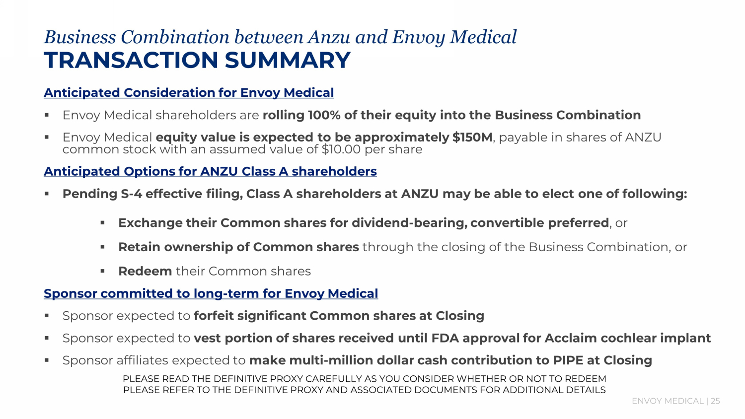 ENVOY MEDICAL | 25 Anticipated Consideration for Envoy Medical ▪ Envoy Medical shareholders are rolling 100% of their equity into the Business Combination ▪ Envoy Medical equity value is expected to be approximately $150M , payable in shares of ANZU common stock with an assumed value of $10.00 per share Anticipated Options for ANZU Class A shareholders ▪ Pending S - 4 effective filing, Class A shareholders at ANZU may be able to elect one of following: ▪ Exchange their Common shares for dividend - bearing, convertible preferred , or ▪ Retain ownership of Common shares through the closing of the Business Combination, or ▪ Redeem their Common shares Sponsor committed to long - term for Envoy Medical ▪ Sponsor expected to forfeit significant Common shares at Closing ▪ Sponsor expected to vest portion of shares received until FDA approval for Acclaim cochlear implant ▪ Sponsor affiliates expected to make multi - million dollar cash contribution to PIPE at Closing TRANSACTION SUMMARY Business Combination between Anzu and Envoy Medical PLEASE READ THE DEFINITIVE PROXY CAREFULLY AS YOU CONSIDER WHETHER OR NOT TO REDEEM PLEASE REFER TO THE DEFINITIVE PROXY AND ASSOCIATED DOCUMENTS FOR ADDITIONAL DETAILS