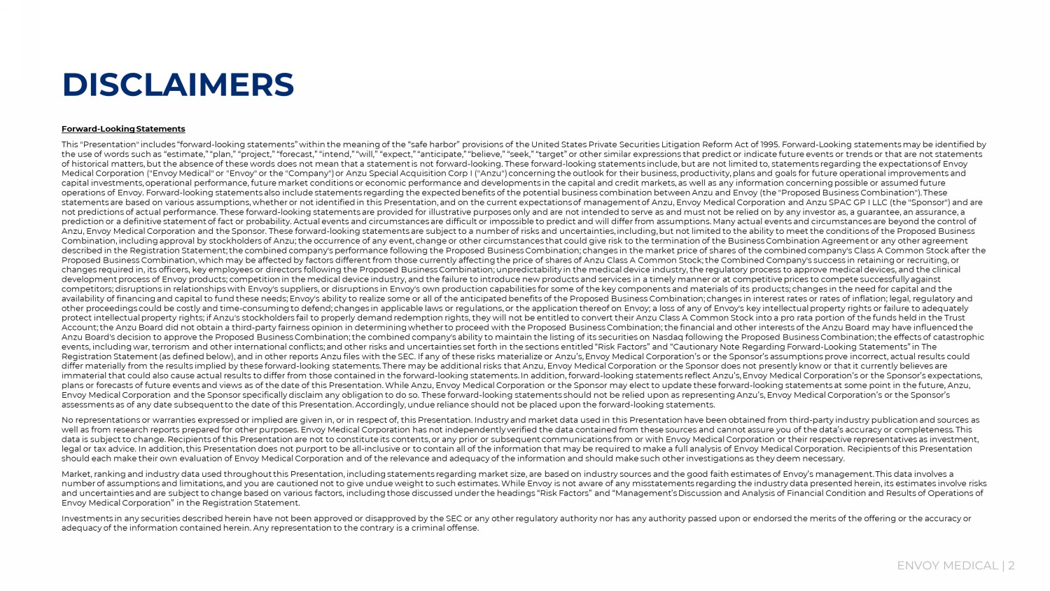 ENVOY MEDICAL | 2 Forward - Looking Statements This "Presentation" includes “forward - looking statements” within the meaning of the “safe harbor” provisions of the United State s Private Securities Litigation Reform Act of 1995. Forward - Looking statements may be identified by the use of words such as “estimate,” “plan,” “project,” “forecast,” “intend,” “will,” “expect,” “anticipate,” “believe,” “see k,” “target” or other similar expressions that predict or indicate future events or trends or that are not statements of historical matters, but the absence of these words does not mean that a statement is not forward - looking. These forward - looki ng statements include, but are not limited to, statements regarding the expectations of Envoy Medical Corporation ("Envoy Medical" or "Envoy" or the "Company") or Anzu Special Acquisition Corp I ("Anzu") concerning the out look for their business, productivity, plans and goals for future operational improvements and capital investments, operational performance, future market conditions or economic performance and developments in the capita l a nd credit markets, as well as any information concerning possible or assumed future operations of Envoy. Forward - looking statements also include statements regarding the expected benefits of the potential busines s combination between Anzu and Envoy (the "Proposed Business Combination"). These statements are based on various assumptions, whether or not identified in this Presentation, and on the current expectations of management of Anzu , Envoy Medical Corporation and Anzu SPAC GP I LLC (the "Sponsor") and are not predictions of actual performance. These forward - looking statements are provided for illustrative purposes only and are not intended to serve as and must not be relied on by any investor as, a guarantee, an assurance, a prediction or a definitive statement of fact or probability. Actual events and circumstances are difficult or impossible to p red ict and will differ from assumptions. Many actual events and circumstances are beyond the control of Anzu , Envoy Medical Corporation and the Sponsor. These forward - looking statements are subject to a number of risks and uncertainties, including, but not limited to the ability to meet the conditions of the Proposed Business Combination, including approval by stockholders of Anzu; the occurrence of any event, change or other circumstances that coul d g ive risk to the termination of the Business Combination Agreement or any other agreement described in the Registration Statement; the combined company's performance following the Proposed Business Combination; chan ges in the market price of shares of the combined company's Class A Common Stock after the Proposed Business Combination, which may be affected by factors different from those currently affecting the price of shares of Anzu Class A Common Stock; the Combined Company's success in retaining or recruiting, or changes required in, its officers, key employees or directors following the Proposed Business Combination; unpredictability i n t he medical device industry, the regulatory process to approve medical devices, and the clinical development process of Envoy products; competition in the medical device industry, and the failure to introduce new products and services in a timely manner or at competitive prices to compete successfully against competitors; disruptions in relationships with Envoy's suppliers, or disruptions in Envoy's own production capabilities for s ome of the key components and materials of its products; changes in the need for capital and the availability of financing and capital to fund these needs; Envoy's ability to realize some or all of the anticipated benefits of the Proposed Business Combination; changes in interest rates or rates of inflation; legal, regulatory and other proceedings could be costly and time - consuming to defend; changes in applicable laws or regulations, or the application th ereof on Envoy; a loss of any of Envoy's key intellectual property rights or failure to adequately protect intellectual property rights; if Anzu's stockholders fail to properly demand redemption rights, they will not be enti tle d to convert their Anzu Class A Common Stock into a pro rata portion of the funds held in the Trust Account; the Anzu Board did not obtain a third - party fairness opinion in determining whether to proceed with the Proposed Busine ss Combination; the financial and other interests of the Anzu Board may have influenced the Anzu Board's decision to approve the Proposed Business Combination; the combined company's ability to maintain the listing of it s securities on Nasdaq following the Proposed Business Combination; the effects of catastrophic events, including war, terrorism and other international conflicts; and other risks and uncertainties set forth in the sectio ns entitled “Risk Factors” and “Cautionary Note Regarding Forward - Looking Statements” in The Registration Statement (as defined below), and in other reports Anzu files with the SEC. If any of these risks materialize or Anzu’s , Envoy Medical Corporation’s or the Sponsor’s assumptions prove incorrect, actual results could differ materially from the results implied by these forward - looking statements. There may be additional risks that Anzu , Envoy Medical Corporation or the Sponsor does not presently know or that it currently believes are immaterial that could also cause actual results to differ from those contained in the forward - looking statements. In addition, f orward - looking statements reflect Anzu’s , Envoy Medical Corporation’s or the Sponsor’s expectations, plans or forecasts of future events and views as of the date of this Presentation. While Anzu , Envoy Medical Corporation or the Sponsor may elect to update these forward - looking statements at some point in the future, Anzu , Envoy Medical Corporatio
