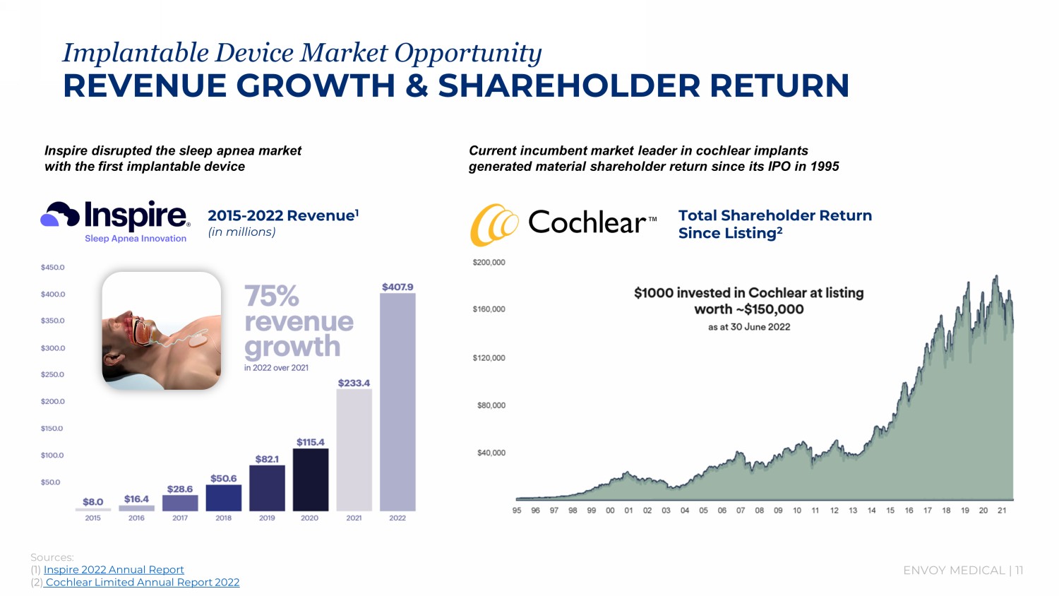 ENVOY MEDICAL | 10 DISCREET AND IMPLANTABLE MEDICAL TECHNOLOGY CONTINUES TO INNOVATE MARKETS Sleep Apnea Fully Implanted Cochlear Implants Glucose Monitoring Pacemaker FDA Approves Inspire ® Upper Airway Stimulation (UAS) Therapy for Obstructive Sleep Apnea FDA Breakthrough Designation granted for Envoy’s fully implantable cochlear implants FDA approves first continuous glucose monitoring system with a fully implantable glucose sensor and compatible mobile app for adults with diabetes FDA approves the first leadless pacemaker to treat cardiac arrhythmias Source: Mayoclinic.org Source: senseonics.com Source: mddionline.com