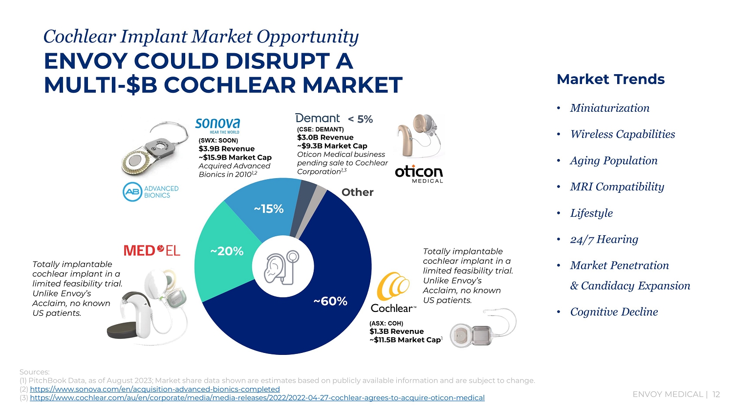 ENVOY MEDICAL | 14 Companies Description Revenue (USD) 1 Gross Margin (%) 1 Market Cap (USD) 1 (SWX: SOON) Sonova is one of the world's largest manufacturers and distributors of hearing aids. The company is based in Switzerland and distributes its products in more than 100 countries through its internal sales team and independent retailers. It also sells cochlear implants through its advanced bionics subsidiary. ~$3.9B TTM Total As of 31 March 2023 71% ~ $15.8B (ASX: COH) Cochlear is the leading cochlear implant device manufacturer with around 60% global market share. Developed markets contribute 80% of group revenue where cochlear implants are the standard of care for children with severe to profound hearing loss. The company also actively targets the growing cohort of seniors in developed markets. Main products include cochlear implants, bone - anchored hearing aids, and associated sound processors. ~$1.2B TTM Total As of 30 - June - 2022 ~ $9.9B (CSE: DEMANT) Demant is a Denmark - based manufacturer and distributor of hearing solutions, such as hearing aid devices and audio diagnostic equipment. More than 80% of the company's sales come from North America and Europe. ~$2.9B TTM Total As of 30 - June - 2022 75% ~ $6.5B 75% Source: (1) PitchBook Data as of August 2023 Cochlear implant focused companies trading at higher multiples MULTI - $B MARKET CAP INCUMBENTS WITH ATTRACTIVE GROSS MARGINS expects to be brought public at equity rollover value of 1 - 3% of any of the incumbents