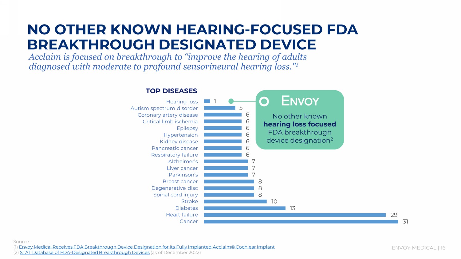 ENVOY MEDICAL | 16 1 5 6 6 6 6 6 6 6 7 7 7 8 8 8 10 13 29 31 No other known hearing loss focused FDA breakthrough device designation 2 Alzheimer’s Heart failure Cancer Spinal cord injury Hearing loss Autism spectrum disorder Stroke Diabetes Breast cancer Degenerative disc Liver cancer Critical limb ischemia Parkinson’s Coronary artery disease Epilepsy Hypertension Kidney disease Pancreatic cancer Respiratory failure Source: (1) Envoy Medical Receives FDA Breakthrough Device Designation for its Fully Implanted Acclaim® Cochlear Implant (2) STAT Database of FDA - Designated Breakthrough Devices (as of December 2022) NO OTHER KNOWN HEARING - FOCUSED FDA BREAKTHROUGH DESIGNATED DEVICE Acclaim is focused on breakthrough to “improve the hearing of adults diagnosed with moderate to profound sensorineural hearing loss." 1 TOP DISEASES