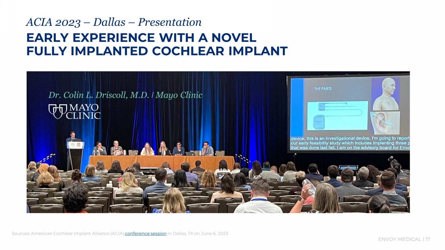 ENVOY MEDICAL | 17 EARLY EXPERIENCE WITH A NOVEL FULLY IMPLANTED COCHLEAR IMPLANT ACIA 2023 – Dallas – Presentation Dr. Colin L. Driscoll, M.D. ǀ Mayo Clinic Sources: American Cochlear Implant Alliance (ACIA) conference session in Dallas, TX on June 6, 2023
