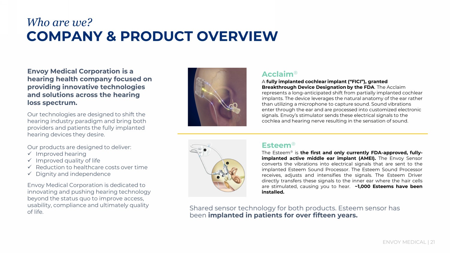 ENVOY MEDICAL | 21 COMPANY & PRODUCT OVERVIEW Envoy Medical Corporation is a hearing health company focused on providing innovative technologies and solutions across the hearing loss spectrum. Our technologies are designed to shift the hearing industry paradigm and bring both providers and patients the fully implanted hearing devices they desire. Our products are designed to deliver: x Improved hearing x Improved quality of life x Reduction to healthcare costs over time x Dignity and independence Envoy Medical Corporation is dedicated to innovating and pushing hearing technology beyond the status quo to improve access, usability, compliance and ultimately quality of life. Acclaim ® A fully implanted cochlear implant (“FICI”), granted Breakthrough Device Designation by the FDA . The Acclaim represents a long - anticipated shift from partially implanted cochlear implants. The device leverages the natural anatomy of the ear rather than utilizing a microphone to capture sound. Sound vibrations enter through the ear and are processed into customized electronic signals. Envoy’s stimulator sends these electrical signals to the cochlea and hearing nerve resulting in the sensation of sound. Esteem ® The Esteem ® is the first and only currently FDA - approved, fully - implanted active middle ear implant (AMEI) . The Envoy Sensor converts the vibrations into electrical signals that are sent to the implanted Esteem Sound Processor . The Esteem Sound Processor receives, adjusts and intensifies the signals . The Esteem Driver directly transfers these signals to the inner ear where the hair cells are stimulated, causing you to hear . ~ 1 , 000 Esteems have been installed . Shared sensor technology for both products. Esteem sensor has been implanted in patients for over fifteen years. Who are we?