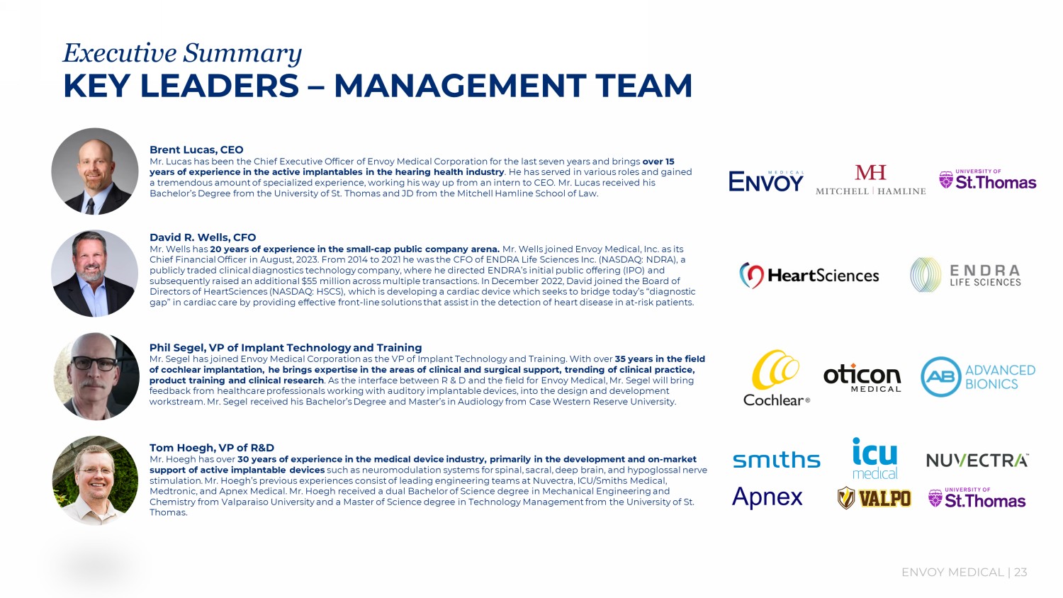 ENVOY MEDICAL | 23 KEY LEADERS – MANAGEMENT TEAM Executive Summary Brent Lucas, CEO Mr. Lucas has been the Chief Executive Officer of Envoy Medical Corporation for the last seven years and brings over 15 years of experience in the active implantables in the hearing health industry . He has served in various roles and gained a tremendous amount of specialized experience, working his way up from an intern to CEO. Mr. Lucas received his Bachelor’s Degree from the University of St. Thomas and JD from the Mitchell Hamline School of Law. Phil Segel , VP of Implant Technology and Training Mr. Segel has joined Envoy Medical Corporation as the VP of Implant Technology and Training. With over 35 years in the field of cochlear implantation, he brings expertise in the areas of clinical and surgical support, trending of clinical practice, product training and clinical research . As the interface between R & D and the field for Envoy Medical, M r. Segel will bring feedback from healthcare professionals working with auditory implantable devices, into the design and development workstream. Mr. Segel received his Bachelor’s Degree and Master’s in Audiology from Case Western Reserve University. Tom Hoegh , VP of R&D Mr. Hoegh has over 30 years of experience in the medical device industry, primarily in the development and on - market support of active implantable devices such as neuromodulation systems for spinal, sacral, deep brain, and hypoglossal nerve stimulation. Mr. Hoegh’s previous experiences consist of leading engineering teams at Nuvectra , ICU/Smiths Medical, Medtronic, and Apnex Medical. Mr. Hoegh received a dual Bachelor of Science degree in Mechanical Engineering and Chemistry from Valparaiso University and a Master of Science degree in Technology Management from the University of St. Thomas. David R. Wells , CFO Mr. Wells has 20 years of experience in the small - cap public company arena. Mr. Wells joined Envoy Medical, Inc. as its Chief Financial Officer in August, 2023. From 2014 to 2021 he was the CFO of ENDRA Life Sciences Inc. (NASDAQ: NDRA), a publicly traded clinical diagnostics technology company, where he directed ENDRA’s initial public offering (IPO) and subsequently raised an additional $55 million across multiple transactions. In December 2022, David joined the Board of Directors of HeartSciences (NASDAQ: HSCS), which is developing a cardiac device which seeks to bridge today’s “diagnostic gap” in cardiac care by providing effective front - line solutions that assist in the detection of heart disease in at - risk patien ts.