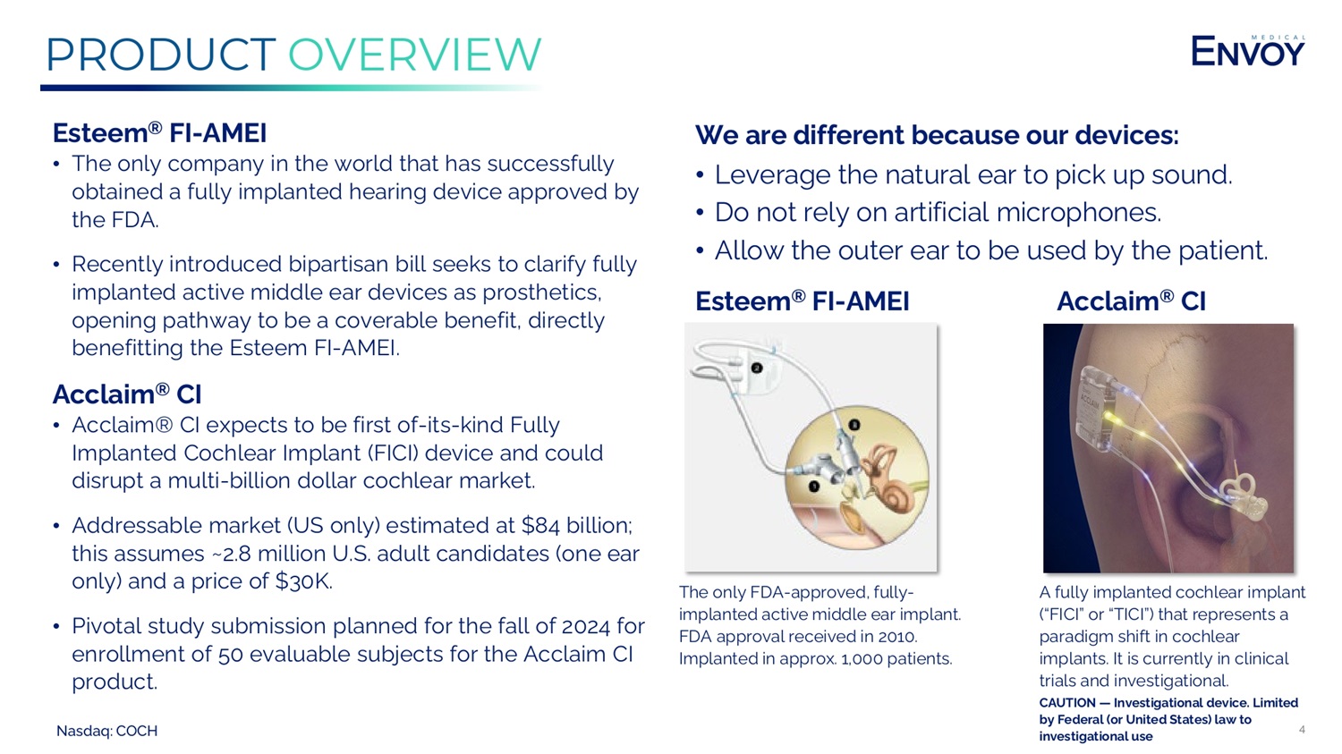 Nasdaq: COCH 3 INVESTMENT OVERVIEW & KEY METRICS Envoy Medical (NASDAQ: COCH): • Innovative hearing health company based in the United States (MN) focused on hearing implants. • Leading the way in “fully” or “totally” implanted hearing devices. • Only company with an FDA - approved, fully implanted hearing device (the Esteem ® ). • Fully implantable devices disrupt a stagnant hearing industry. • Dedicated to improving patient access, usability, compliance, and ultimately quality of life. ENVOY MEDICAL NASDAQ: COCH $2.30 Stock Price (as of 7/1/24) $4.9M Cash Balance (March 31, 2024) 19.6 Common Shares Outstanding 43.5M Fully Diluted Shares Outstanding $46M Market Capitalization 35,000 Average Daily Volume, 50 day (per Nasdaq)