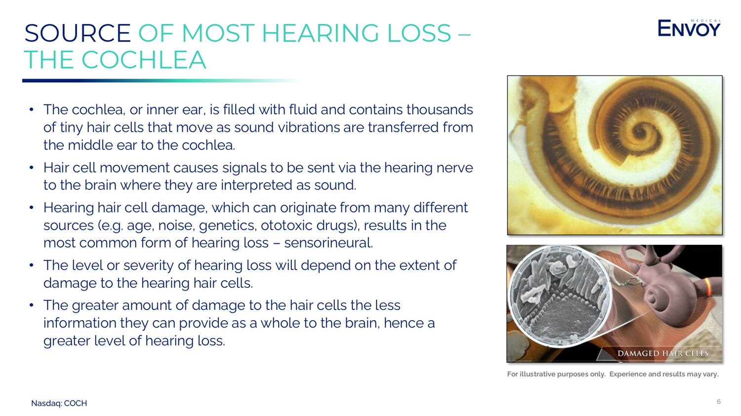 Nasdaq: COCH 5 HOW SOUND TRAVELS THROUGH THE EAR Sound waves travel down the ear canal and hit the eardrum The waves are transmitted mechanically through the ossicular chain to the cochlea The cochlea converts sound waves to electrical signals which travel to the brain via the auditory nerve Outer ear collects sound waves and funnels them to the ear canal 1 2 3 4 For illustrative purposes only. Experience and results may vary.