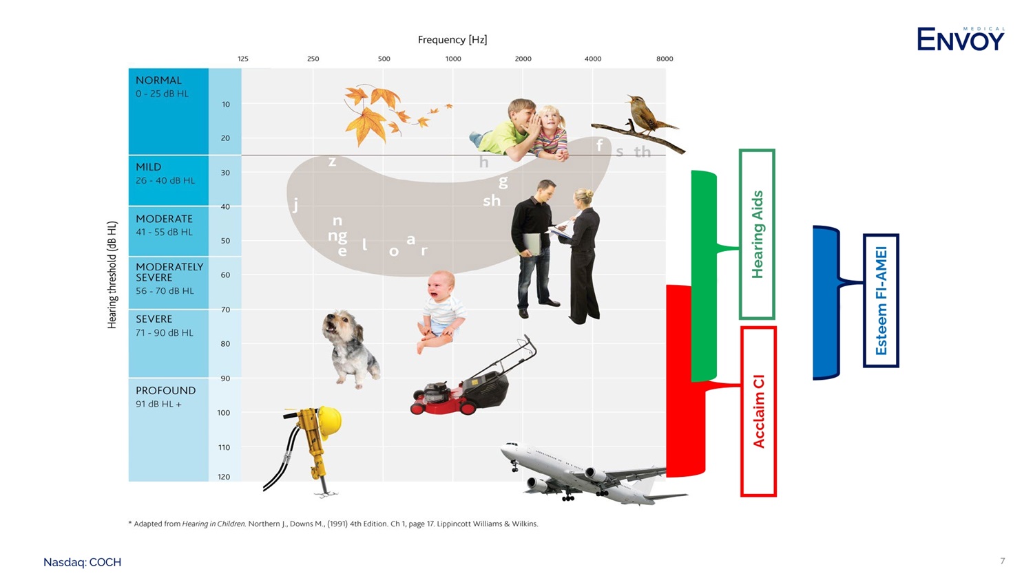 Nasdaq: COCH 6 SOURCE OF MOST HEARING LOSS – THE COCHLEA • The cochlea, or inner ear, is filled with fluid and contains thousands of tiny hair cells that move as sound vibrations are transferred from the middle ear to the cochlea. • Hair cell movement causes signals to be sent via the hearing nerve to the brain where they are interpreted as sound. • Hearing hair cell damage, which can originate from many different sources (e.g. age, noise, genetics, ototoxic drugs), results in the most common form of hearing loss – sensorineural. • The level or severity of hearing loss will depend on the extent of damage to the hearing hair cells. • The greater amount of damage to the hair cells the less information they can provide as a whole to the brain, hence a greater level of hearing loss. For illustrative purposes only. Experience and results may vary.