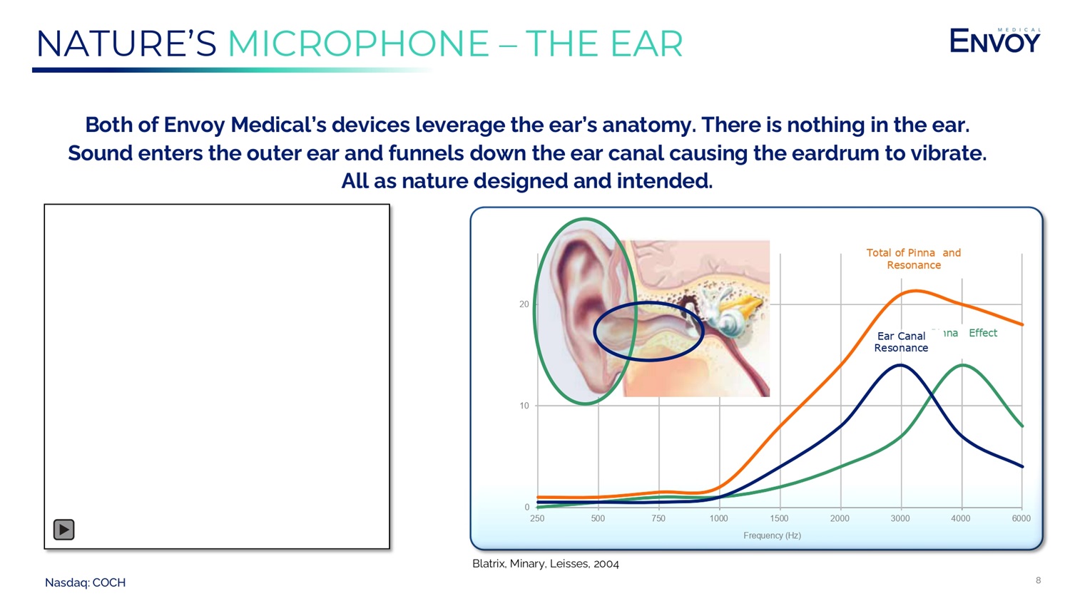 Nasdaq: COCH 8 NATURE’S MICROPHONE – THE EAR Both of Envoy Medical’s devices leverage the ear’s anatomy. There is nothing in the ear. Sound enters the outer ear and funnels down the ear canal causing the eardrum to vibrate. All as nature designed and intended. 0 10 20 250 500 750 1000 1500 2000 3000 4000 6000 Frequency (Hz) Total of Pinna and Resonance Pinna Effect Ear Canal Resonance Blatrix , Minary , Leisses , 2004