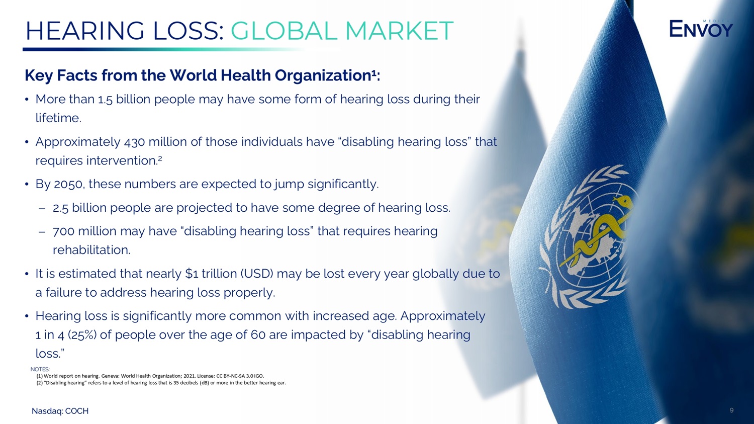 Nasdaq: COCH 9 HEARING LOSS: GLOBAL MARKET Key Facts from the World Health Organization 1 : • More than 1.5 billion people may have some form of hearing loss during their lifetime. • Approximately 430 million of those individuals have “disabling hearing loss” that requires intervention. 2 • By 2050, these numbers are expected to jump significantly. ⎼ 2.5 billion people are projected to have some degree of hearing loss. ⎼ 700 million may have “disabling hearing loss” that requires hearing rehabilitation. • It is estimated that nearly $1 trillion (USD) may be lost every year globally due to a failure to address hearing loss properly. • Hearing loss is significantly more common with increased age. Approximately 1 in 4 (25%) of people over the age of 60 are impacted by “disabling hearing loss.” NOTES: (1) (1) World report on hearing. Geneva: World Health Organization; 2021. License: CC BY - NC - SA 3.0 IGO. (2) (2) “Disabling hearing” refers to a level of hearing loss that is 35 decibels (dB) or more in the better hearing ear.