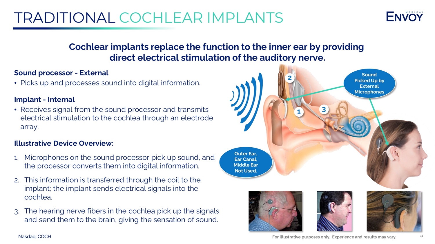Nasdaq: COCH 10 ~2.8M U.S. ADULTS MAY BE CANDIDATES FOR COCHLEAR IMPLANTS 1 • “Hearing loss is the third most common chronic physical condition in the United States and is twice as prevalent as diabetes or cancer.” 5 • Approximately 48 million Americans have some form of hearing loss. Over the next four decades, that number may increase to approximately 80 million. 6 • As Americans live longer, more people will experience hearing loss. 6 ⎼ 68% of people in their 70s experience hearing loss. 7 ⎼ 90% of people 80 or older experience hearing loss. 7 • Age - related hearing loss has been estimated to have an economic cost to society of approximately $297,000 (USD) per affected person over their lifetime. 8 • Hearing loss is correlated with risk of cognitive decline, depression, anxiety, and a higher risk of falls. 6 Only ~5% - 8% of the people that could benefit from an implantable hearing solution have received one. 2 Our View: a primary reason adults do not get cochlear implants is the external hardware. NOTES: 1. Goman , Adele M., and Frank R. Lin. "Prevalence of hearing loss by severity in the United States." American journal of public healt h 106.10 (2016): 1820 - 1822.; Goman , Adele M., Nicholas S. Reed, and Frank R. Lin. "Addressing estimated hearing loss in adults in 2060." JAMA Otolaryngology – Head & Neck Surgery 143.7 (2017): 733 - 734 2. Cochlear Limited Annual Report 2022 3. S2N Market Model prepared for Envoy Medical Corporation 4. Assumes device price of ~$30,000 for 2.8M U.S. population of potential candidates for cochlear implants ~$84B and growing untapped potential cochlear implant U.S. market opportunity 3,4 5. CDC citing Blackwell DL, Lucas JW, Clarke TC. Summary health statistics for US adults: National Health Interview Survey, 2012. Vital Health Stat 10. 2014;260:1 - 161. 6. Everett, Carla. National Council on Aging. (2023) https:// www.ncoa.org /adviser/hearing - aids/hearing - loss - america / 7. Goman , Adele M. and Lin, Frank R. Prevalence of Hearing Loss by Severity in the United States. American Journal of Public Health. 2016. Found on the internet at https:// www.ncbi.nlm.nih.gov / pmc /articles/PMC5024365/ 8. National Academies of Sciences, Engineering, and Medicine. Hearing health care for adults: Priorities for improving access an d affordability. Washington, DC: The National Academies Press; 2016. (doi:10.17226/23446)