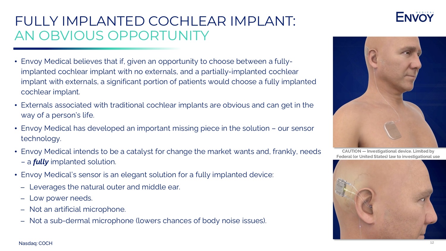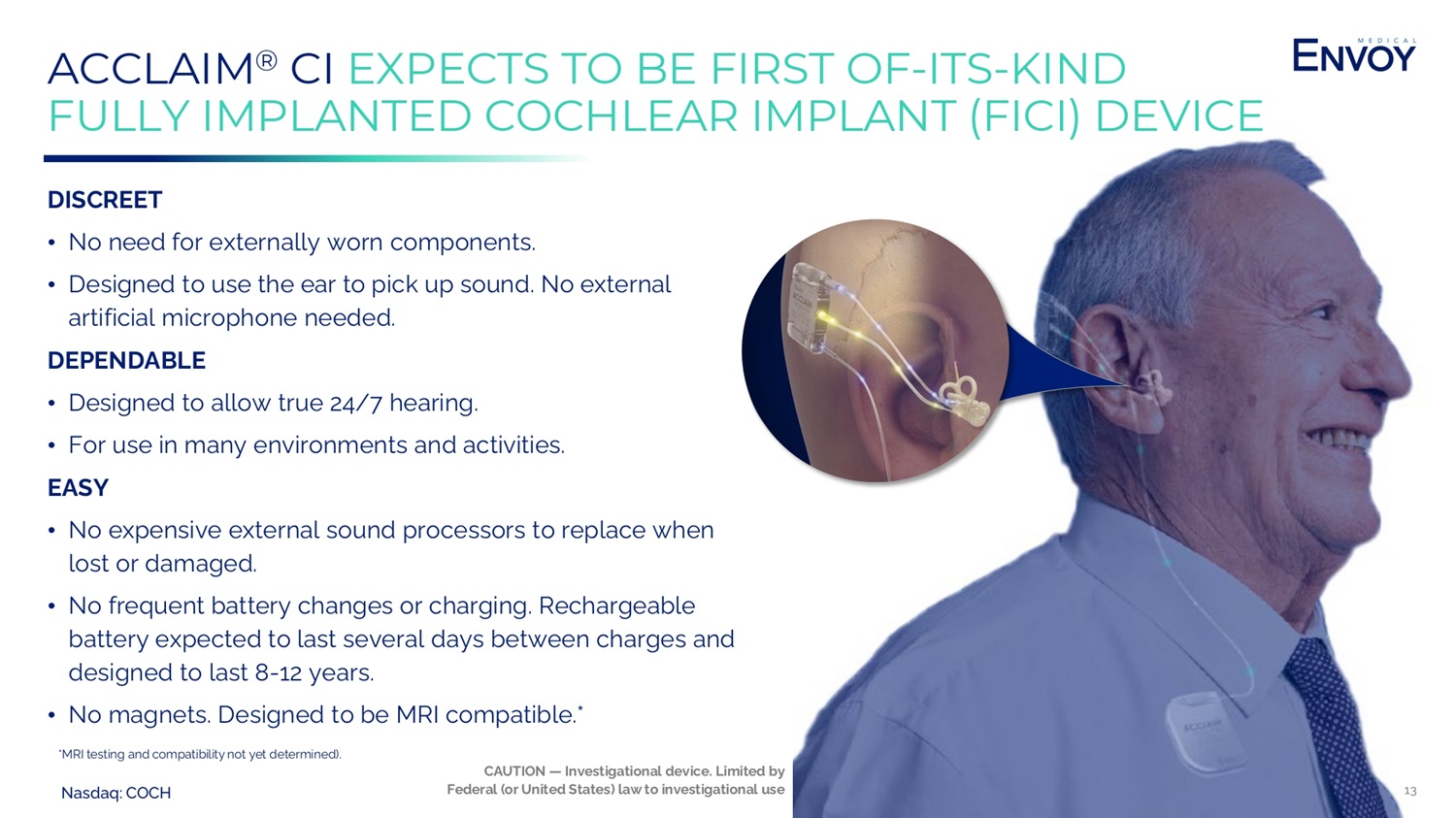 Nasdaq: COCH 12 FULLY IMPLANTED COCHLEAR IMPLANT: AN OBVIOUS OPPORTUNITY • Envoy Medical believes that if, given an opportunity to choose between a fully - implanted cochlear implant with no externals, and a partially - implanted cochlear implant with externals, a significant portion of patients would choose a fully implanted cochlear implant. • Externals associated with traditional cochlear implants are obvious and can get in the way of a person’s life. • Envoy Medical has developed an important missing piece in the solution – our sensor technology. • Envoy Medical intends to be a catalyst for change the market wants and, frankly, needs – a fully implanted solution. • Envoy Medical’s sensor is an elegant solution for a fully implanted device: ⎼ Leverages the natural outer and middle ear. ⎼ Low power needs. ⎼ Not an artificial microphone. ⎼ Not a sub - dermal microphone (lowers chances of body noise issues). CAUTION — Investigational device. Limited by Federal (or United States) law to investigational use