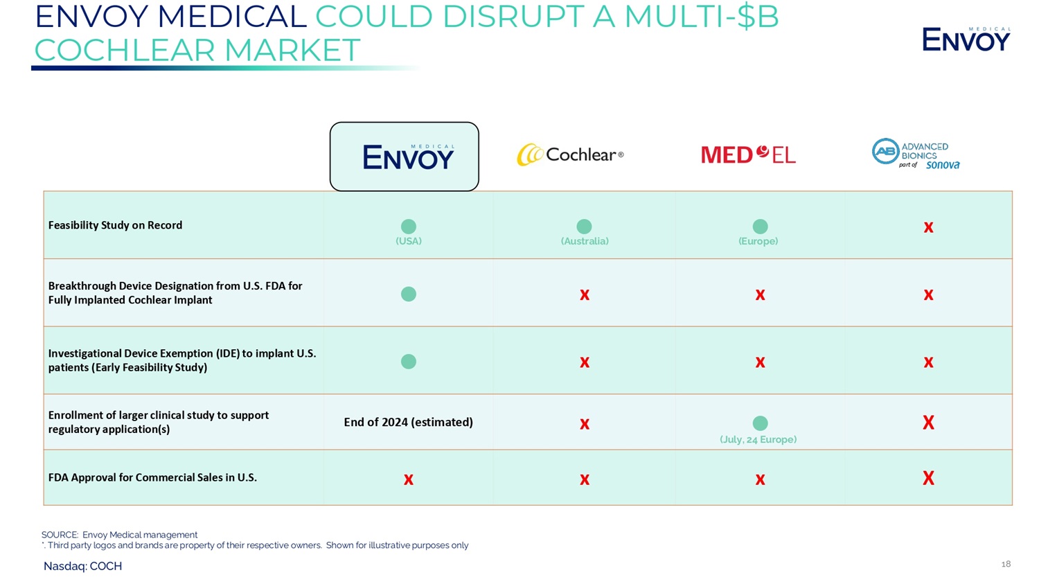 Nasdaq: COCH 17 COMPLACENT EXISTING PARTICIPANTS Market Share: ≈65% (ASX: COH) $1.2B Revenue ~$9.9B Market Cap 1 Market Share: ≈15% Privately Held Market Share: ≈10% (SWX: SOON) $3.9B Revenue ~$15.8B Market Cap NOTE: 1. PitchBook Data, as of August 2023; Market share data shown are estimates based on publicly available information and are subject to cha ng e. *. Third party logos and brands are property of their respective owners. Shown for illustrative purposes only SOURCE: Cochlear Ltd. SOURCE: Med - EL SOURCE: Advanced Bionics Market Cap (USD) 1 Gross Margin (%) 1 Revenue (USD) 1 DESCRIPTION COMPANIES ~$13.8B 75% $1.3B TTM Total As of 30 - June - 2023 Cochlear is the leading cochlear implant device manufacturer with around 60% global market share. Developed markets contribute 80% of group revenue where cochlear implants are the standard of care for children with severe to profound hearing loss. The company also actively targets the growing cohort of seniors in developed markets. Main products include cochlear implants, bone - anchored hearing aids, and associated sound processors. 71% 71% $3.9B TTM Total As of 31 March 2023 Sonova is one of the world's largest manufacturers and distributors of hearing aids. The company is based in Switzerland and distributes its products in more than 100 countries through its internal sales team and independent retailers. It also sells cochlear implants through its advanced bionics subsidiary. Current Market Cap of Envoy Medical (COCH) is less than 1% of the existing players. Our belief is that difference will not continue to be as great over time.