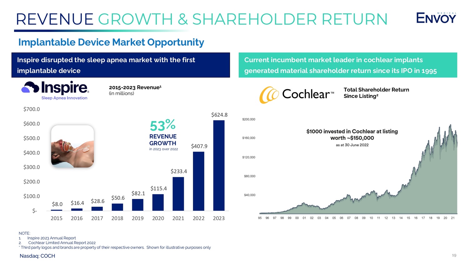 Nasdaq: COCH 18 ENVOY MEDICAL COULD DISRUPT A MULTI - $B COCHLEAR MARKET x • • • Feasibility Study on Record x x x • Breakthrough Device Designation from U.S. FDA for Fully Implanted Cochlear Implant x x x • Investigational Device Exemption (IDE) to implant U.S. patients (Early Feasibility Study) X • x End of 2024 (estimated) Enrollment of larger clinical study to support regulatory application(s) X x x x FDA Approval for Commercial Sales in U.S. part of (USA) (Europe) (Australia) SOURCE: Envoy Medical management *. Third party logos and brands are property of their respective owners. Shown for illustrative purposes only (July, 24 Europe)