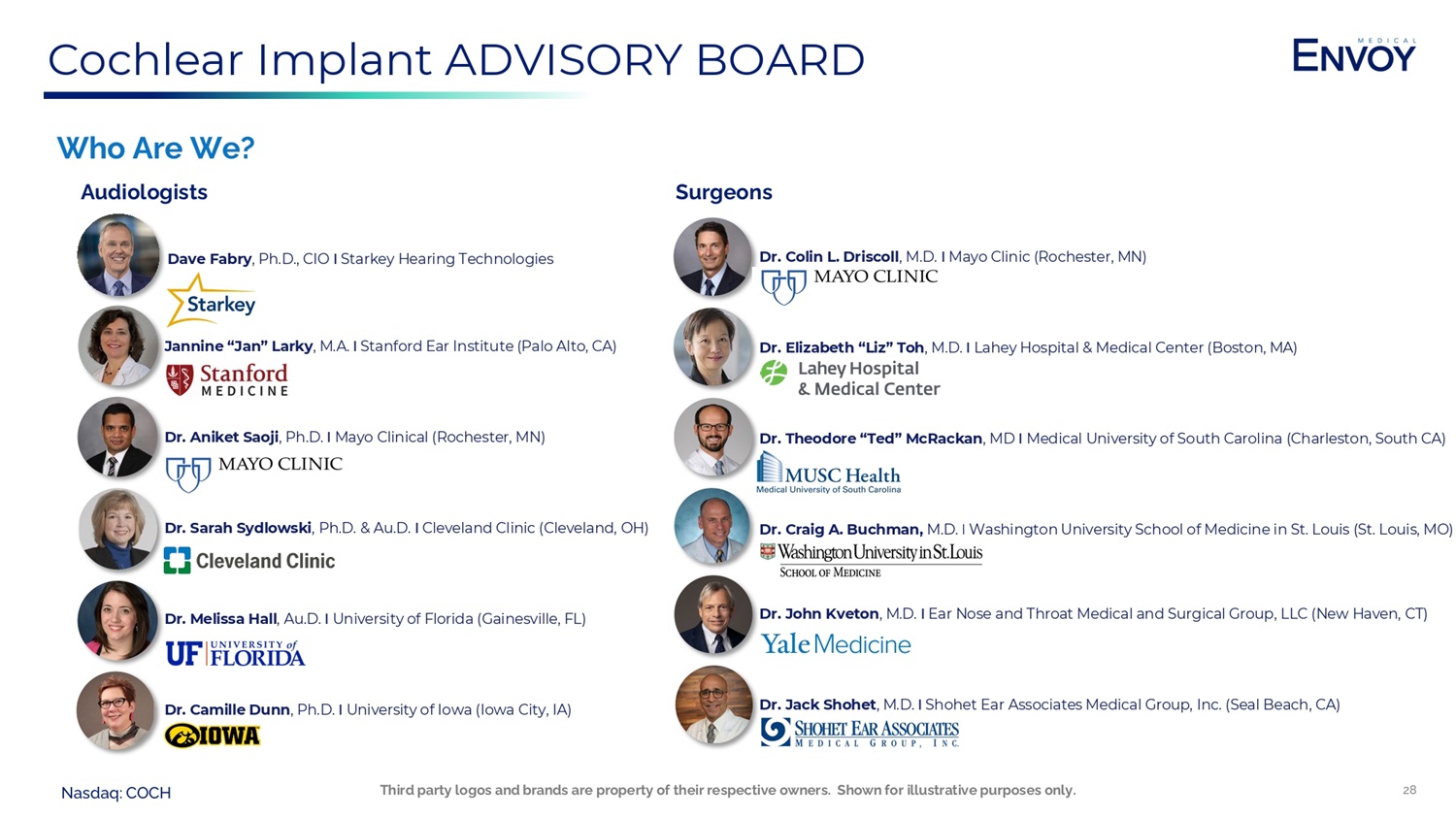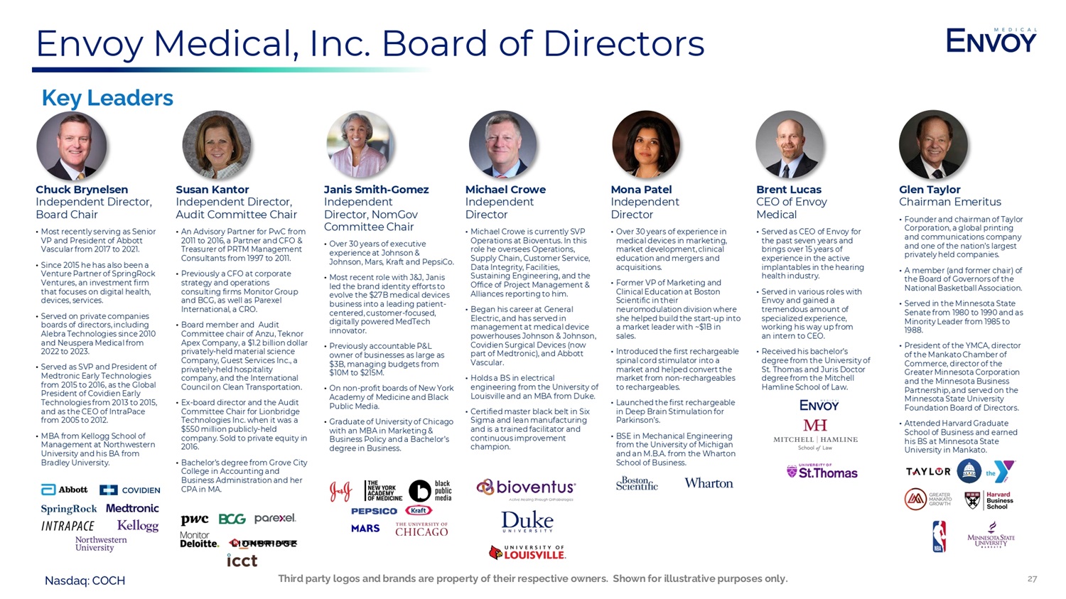 Nasdaq: COCH Envoy Medical, Inc. Board of Directors Glen Taylor Chairman Emeritus • Founder and chairman of Taylor Corporation, a global printing and communications company and one of the nation’s largest privately held companies. • A member (and former chair) of the Board of Governors of the National Basketball Association. • Served in the Minnesota State Senate from 1980 to 1990 and as Minority Leader from 1985 to 1988. • President of the YMCA, director of the Mankato Chamber of Commerce, director of the Greater Minnesota Corporation and the Minnesota Business Partnership, and served on the Minnesota State University Foundation Board of Directors. • Attended Harvard Graduate School of Business and earned his BS at Minnesota State University in Mankato. Janis Smith - Gomez Independent Director, NomGov Committee Chair • Over 30 years of executive experience at Johnson & Johnson, Mars, Kraft and PepsiCo. • Most recent role with J&J, Janis led the brand identity efforts to evolve the $27B medical devices business into a leading patient - centered, customer - focused, digitally powered MedTech innovator. • Previously accountable P&L owner of businesses as large as $3B, managing budgets from $10M to $215M. • On non - profit boards of New York Academy of Medicine and Black Public Media. • Graduate of University of Chicago with an MBA in Marketing & Business Policy and a Bachelor’s degree in Business. Susan Kantor Independent Director, Audit Committee Chair • An Advisory Partner for PwC from 2011 to 2016, a Partner and CFO & Treasurer of PRTM Management Consultants from 1997 to 2011. • Previously a CFO at corporate strategy and operations consulting firms Monitor Group and BCG, as well as Parexel International, a CRO. • Board member and Audit Committee chair of Anzu, Teknor Apex Company, a $1.2 billion dollar privately - held material science Company, Guest Services Inc., a privately - held hospitality company, and the International Council on Clean Transportation. • Ex - board director and the Audit Committee Chair for Lionbridge Technologies Inc. when it was a $550 million publicly - held company. Sold to private equity in 2016. • Bachelor’s degree from Grove City College in Accounting and Business Administration and her CPA in MA. Mona Patel Independent Director • Over 30 years of experience in medical devices in marketing, market development, clinical education and mergers and acquisitions. • Former VP of Marketing and Clinical Education at Boston Scientific in their neuromodulation division where she helped build the start - up into a market leader with ~$1B in sales. • Introduced the first rechargeable spinal cord stimulator into a market and helped convert the market from non - rechargeables to rechargeables. • Launched the first rechargeable in Deep Brain Stimulation for Parkinson’s. • BSE in Mechanical Engineering from the University of Michigan and an M.B.A. from the Wharton School of Business. Michael Crowe Independent Director • Michael Crowe is currently SVP Operations at Bioventus. In this role he oversees Operations, Supply Chain, Customer Service, Data Integrity, Facilities, Sustaining Engineering, and the Office of Project Management & Alliances reporting to him. • Began his career at General Electric, and has served in management at medical device powerhouses Johnson & Johnson, Covidien Surgical Devices (now part of Medtronic), and Abbott Vascular. • Holds a BS in electrical engineering from the University of Louisville and an MBA from Duke. • Certified master black belt in Six Sigma and lean manufacturing and is a trained facilitator and continuous improvement champion. Brent Lucas CEO of Envoy Medical • Served as CEO of Envoy for the past seven years and brings over 15 years of experience in the active implantables in the hearing health industry. • Served in various roles with Envoy and gained a tremendous amount of specialized experience, working his way up from an intern to CEO. • Received his bachelor’s degree from the University of St. Thomas and Juris Doctor degree from the Mitchell Hamline School of Law. Chuck Brynelsen Independent Director, Board Chair • Most recently serving as Senior VP and President of Abbott Vascular from 2017 to 2021. • Since 2015 he has also been a Venture Partner of SpringRock Ventures, an investment firm that focuses on digital health, devices, services. • Served on private companies boards of directors, including Alebra Technologies since 2010 and Neuspera Medical from 2022 to 2023. • Served as SVP and President of Medtronic Early Technologies from 2015 to 2016, as the Global President of Covidien Early Technologies from 2013 to 2015, and as the CEO of IntraPace from 2005 to 2012. • MBA from Kellogg School of Management at Northwestern University and his BA from Bradley University. Key Leaders 27 Third party logos and brands are property of their respective owners. Shown for illustrative purposes only.