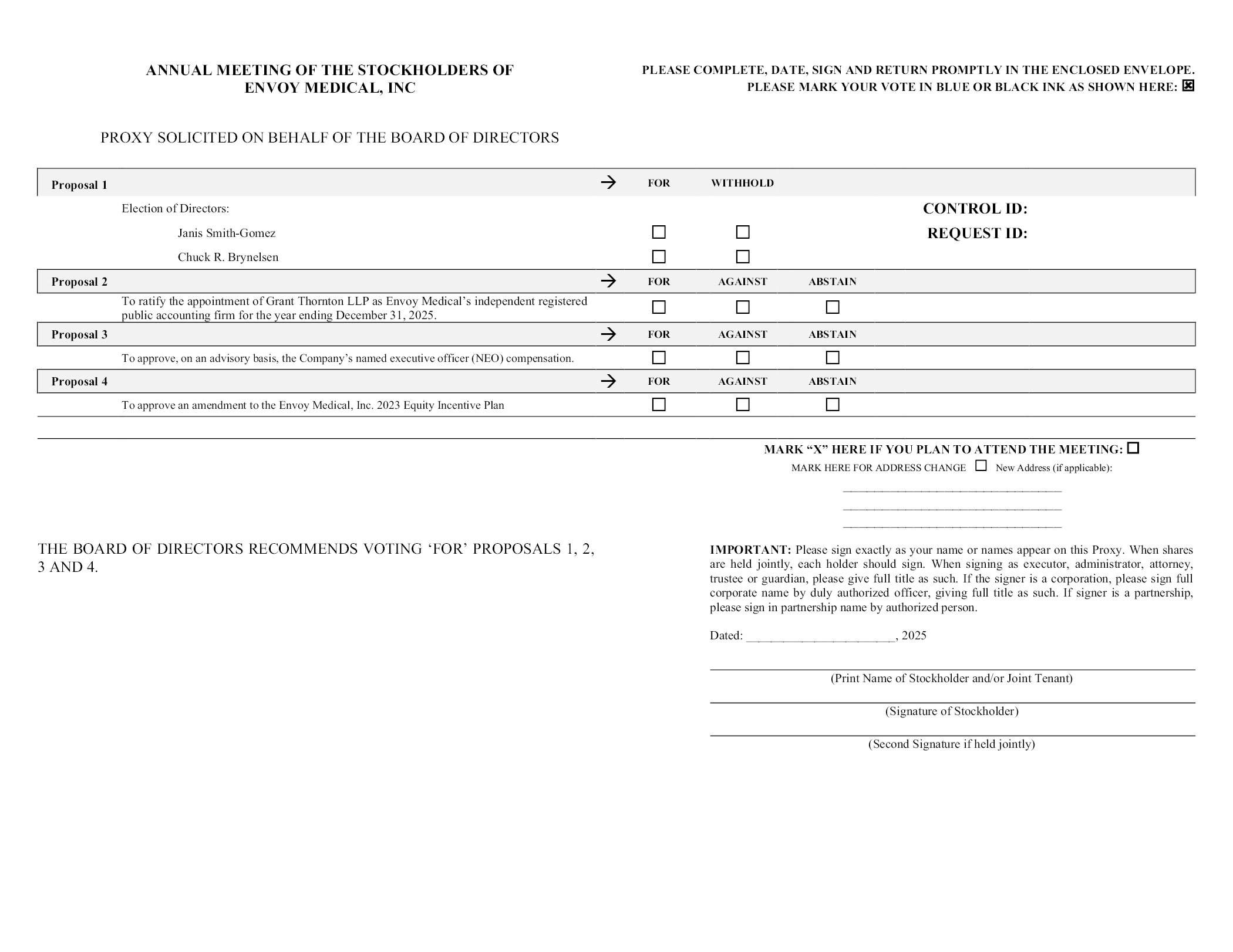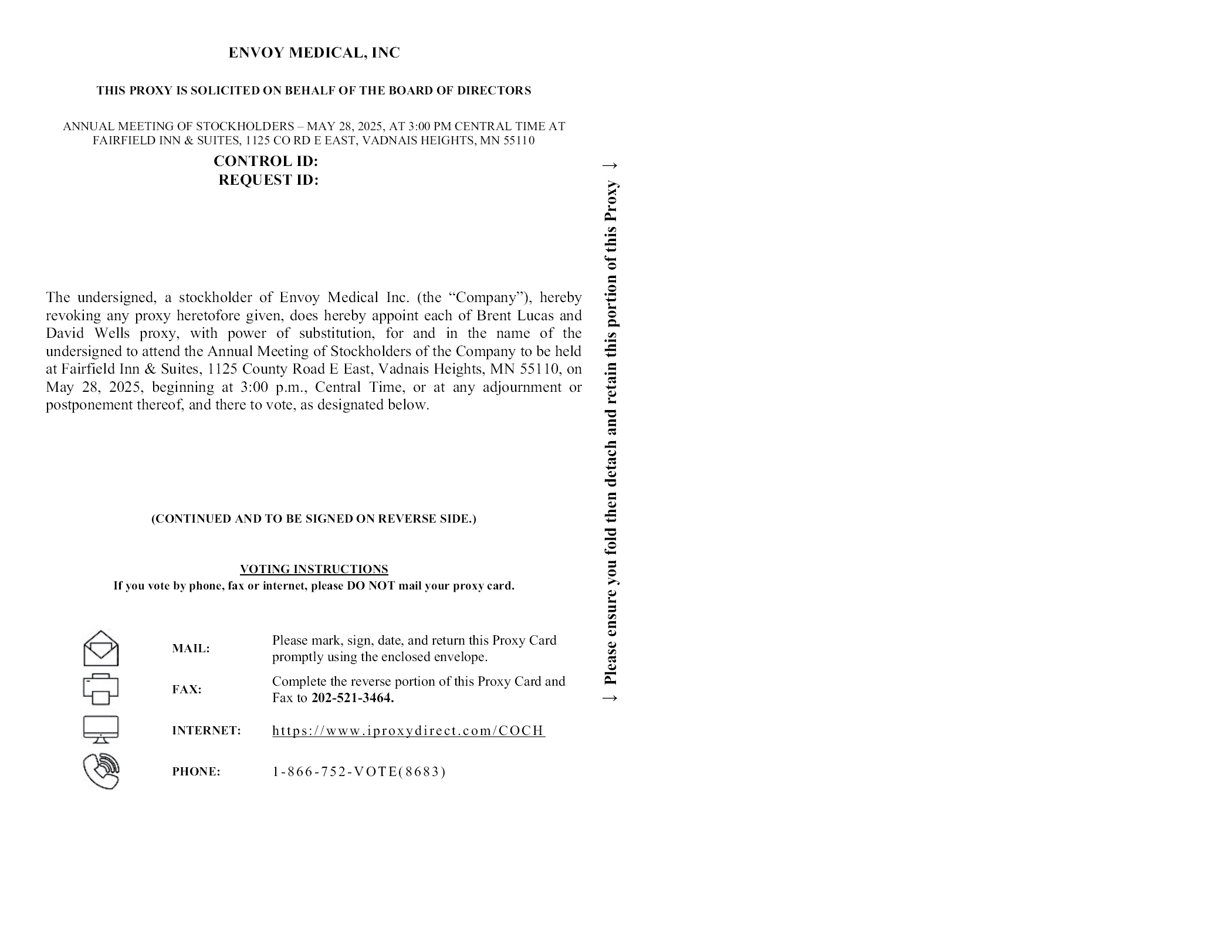 Please Take Notice that Envoy Medical, Inc. (“Envoy Medical” or the “Company”) will hold its 2025 Annual Meeting of Stockholders at Fairfield Inn & Suites, 1125 County Road E East, Vadnais Heights, Minnesota 55110 on May 28, 2025 at 3:00 p.m. local time. Envoy Medical is holding this meeting for the purpose of considering and taking appropriate action with respect to the following:
