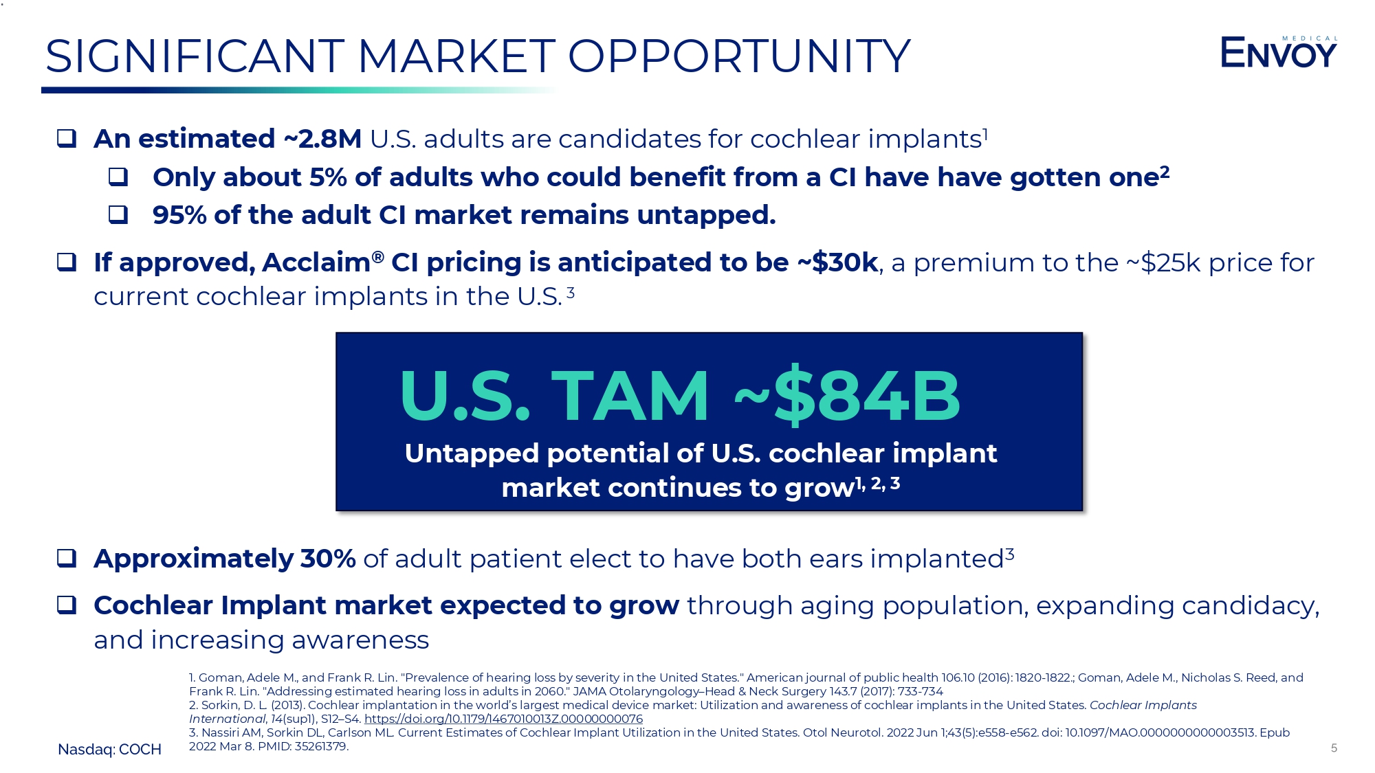 Nasdaq: COCH 4 INVESTMENT HIGHLIGHTS x Hearing health company positioned to transform the multi - billion - dollar cochlear implant (CI) market with the first fully - implanted cochlear implant x Acclaim ® CI candidate in late - stage development: Pivotal trial enrollment anticipated to complete in Q1 2026 (FDA approved trial advancement after first stage) x Estimated $84 billion TAM in the U.S. given the 2.8 million people suffering with severe or profound hearing loss x Significant differentiation: No visible hardware on the patient’s head, ear canal used to pick up sound, proprietary sensor, approximately five days between recharge, more conducive to life (no nighttime removal/wear in shower or pool/may use ear buds) x Validated technology: Acclaim ® CI leverages the sensor technology used in Envoy’s FDA - approved Esteem ® hearing device x Mature and Concentrated Market: Three dominant CI manufacturers; Envoy expects to enter market with a first - of - its - kind differentiated solution x Multiple expected milestones throughout clinical trial with FDA approval anticipated in approximately 24 months (end of 2027) CAUTION — Investigational device. Limited by Federal (or United States) law to investigational use .
