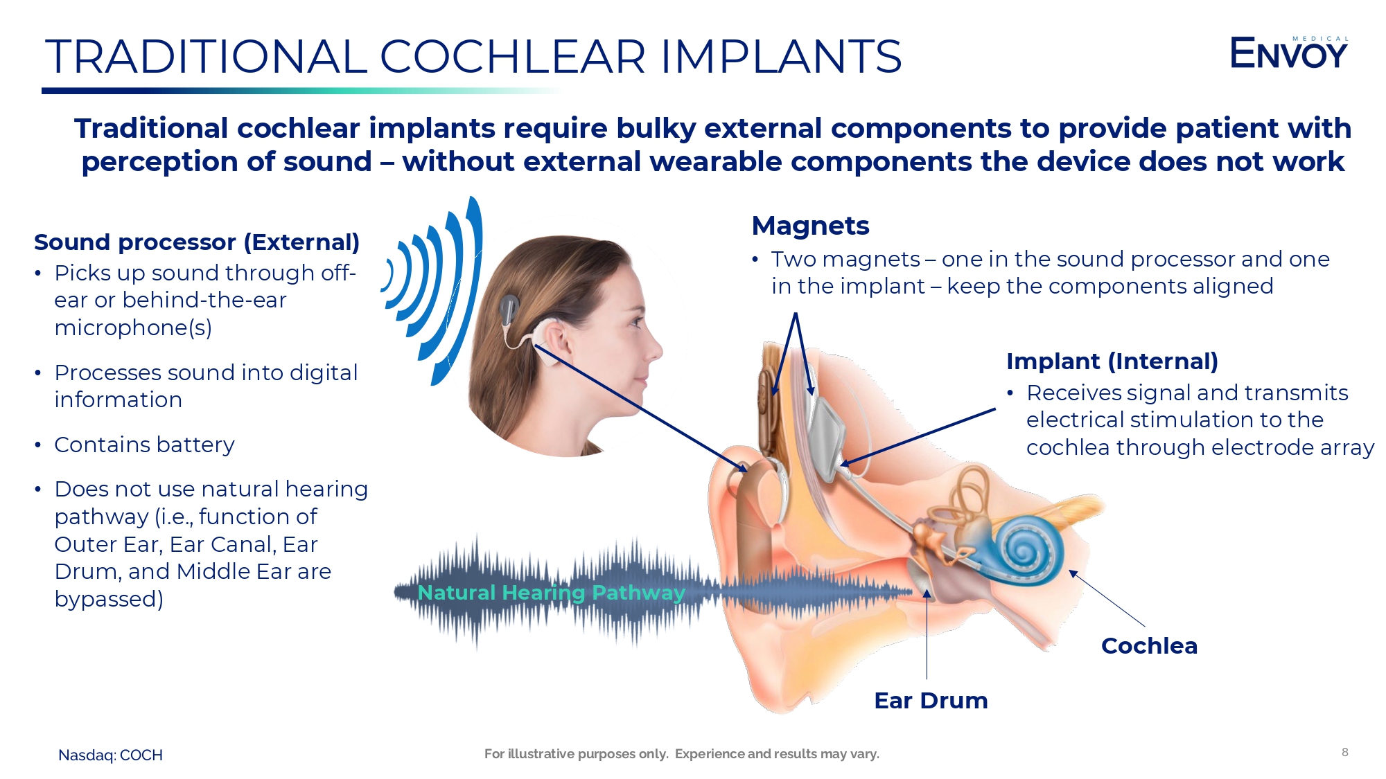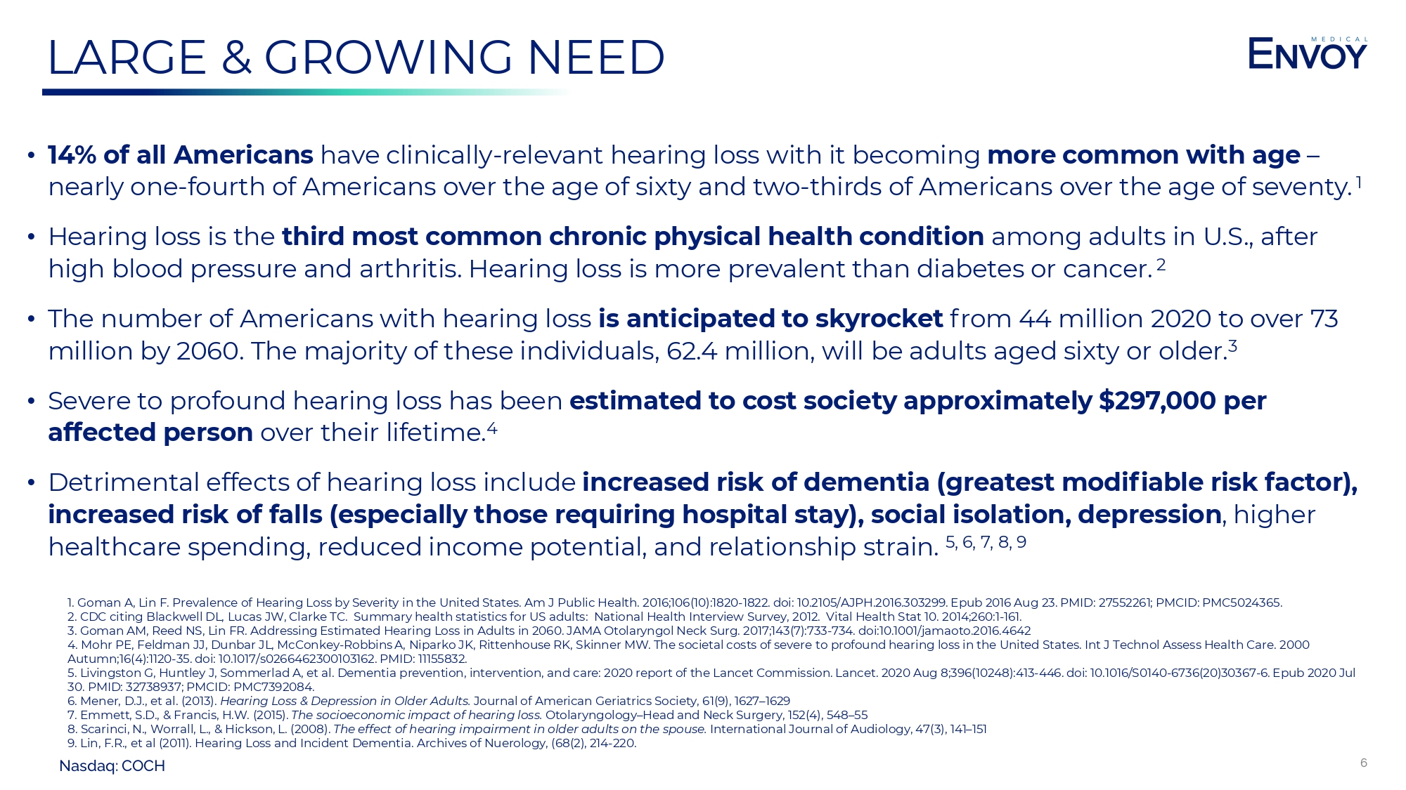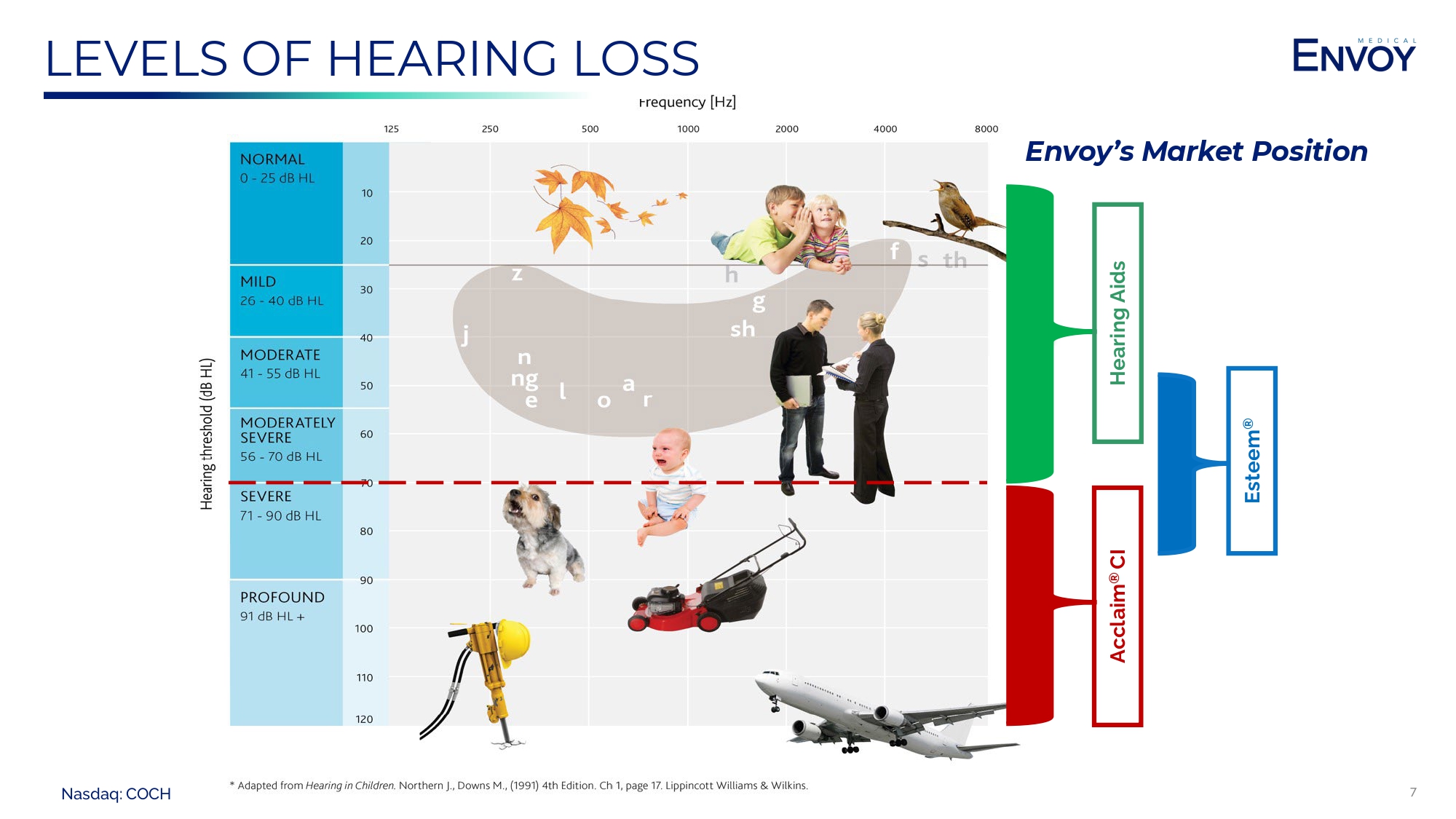 Nasdaq: COCH 6 LARGE & GROWING NEED • 14% of all Americans have clinically - relevant hearing loss with it becoming more common with age – nearly one - fourth of Americans over the age of sixty and two - thirds of Americans over the age of seventy. 1 • Hearing loss is the third most common chronic physical health condition among adults in U.S., after high blood pressure and arthritis. Hearing loss is more prevalent than diabetes or cancer. 2 • The number of Americans with hearing loss is anticipated to skyrocket from 44 million 2020 to over 73 million by 2060. The majority of these individuals, 62.4 million, will be adults aged sixty or older. 3 • Severe to profound hearing loss has been estimated to cost society approximately $297,000 per affected person over their lifetime. 4 • Detrimental effects of hearing loss include increased risk of dementia (greatest modifiable risk factor), increased risk of falls (especially those requiring hospital stay), social isolation, depression , higher healthcare spending, reduced income potential, and relationship strain. 5, 6, 7, 8, 9 1. Goman A, Lin F. Prevalence of Hearing Loss by Severity in the United States. Am J Public Health. 2016;106(10):1820 - 1822. doi : 10.2105/AJPH.2016.303299. Epub 2016 Aug 23. PMID: 27552261; PMCID: PMC5024365. 2. CDC citing Blackwell DL, Lucas JW, Clarke TC. Summary health statistics for US adults: National Health Interview Survey, 20 12. Vital Health Stat 10. 2014;260:1 - 161. 3. Goman AM, Reed NS, Lin FR. Addressing Estimated Hearing Loss in Adults in 2060. JAMA Otolaryngol Neck Surg. 2017;143(7):733 - 734. doi:10.1001/jamaoto.2016.4642 4. Mohr PE, Feldman JJ, Dunbar JL, McConkey - Robbins A, Niparko JK, Rittenhouse RK, Skinner MW. The societal costs of severe to profound hearing loss in the United States. Int J Technol Ass es s Health Care. 2000 Autumn;16(4):1120 - 35. doi : 10.1017/s0266462300103162. PMID: 11155832. 5. Livingston G, Huntley J, Sommerlad A, et al. Dementia prevention, intervention, and care: 2020 report of the Lancet Commission. Lancet. 2020 Aug 8;396(10248):41 3 - 446. doi : 10.1016/S0140 - 6736(20)30367 - 6. Epub 2020 Jul 30. PMID: 32738937; PMCID: PMC7392084. 6. Mener , D.J., et al. (2013). Hearing Loss & Depression in Older Adults. Journal of American Geriatrics Society, 61(9), 1627 – 1629 7. Emmett, S.D., & Francis, H.W. (2015). The socioeconomic impact of hearing loss. Otolaryngology – Head and Neck Surgery, 152(4), 548 – 55 8. Scarinci, N., Worrall, L., & Hickson, L. (2008). The effect of hearing impairment in older adults on the spouse. International Journal of Audiology, 47(3), 141 – 151 9. Lin, F.R., et al (2011). Hearing Loss and Incident Dementia. Archives of Nuerology , (68(2), 214 - 220.