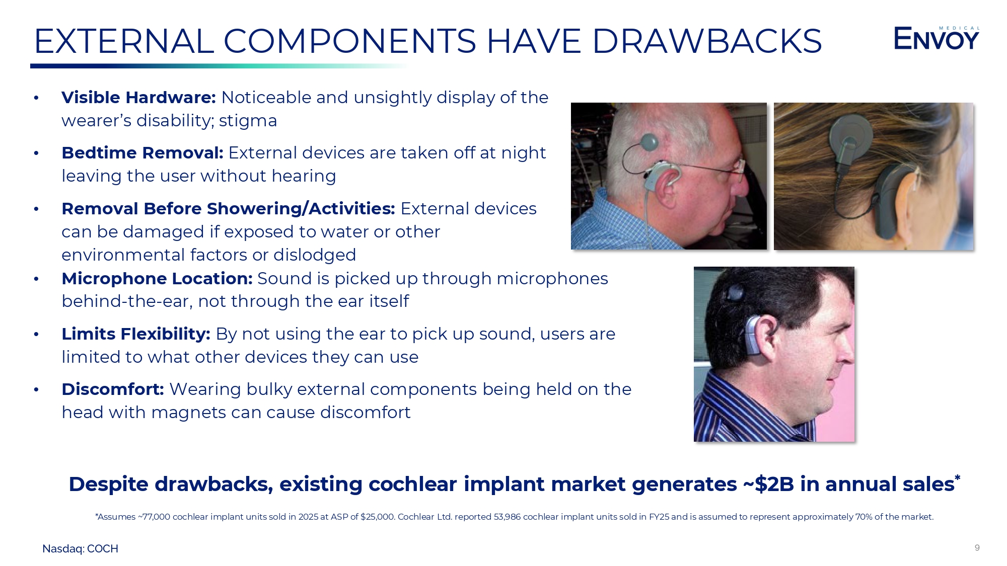 Nasdaq: COCH 9 EXTERNAL COMPONENTS HAVE DRAWBACKS • Visible Hardware: Noticeable and unsightly display of the wearer’s disability; stigma • Bedtime Removal: External devices are taken off at night leaving the user without hearing • Removal Before Showering/Activities: External devices can be damaged if exposed to water or other environmental factors or dislodged Despite drawbacks, existing cochlear implant market generates ~$2B in annual sales * *Assumes ~77,000 cochlear implant units sold in 2025 at ASP of $25,000. Cochlear Ltd. reported 53,986 cochlear implant units sol d in FY25 and is assumed to represent approximately 70% of the market. • Microphone Location: Sound is picked up through microphones behind - the - ear, not through the ear itself • Limits Flexibility: By not using the ear to pick up sound, users are limited to what other devices they can use • Discomfort: Wearing bulky external components being held on the head with magnets can cause discomfort