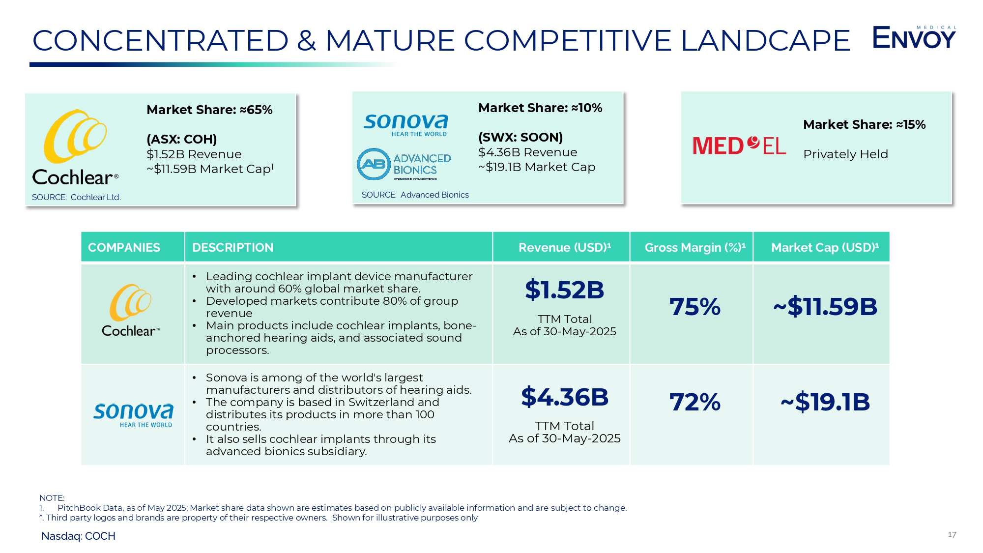 Nasdaq: COCH 16 IMPORTANT DESIGN DIFFERENCES • Cochlear and Med - El use sub - cutaneous microphones. • Envoy Medical uses a piezoelectric middle ear sensor. • Cochlear and Med - El have microphones behind the ear. • Envoy Medical picks up sound through the ear’s natural pathway. • Envoy Medical allows flexibility for other in - ear device use. • Cochlear and Med - El have a smaller capacity battery in the head. • Envoy Medical has larger capacity battery in the chest. • Cochlear and Med - El do not have replaceable battery. • Envoy Medical battery can be replaced independently. • Cochlear and Med - El have a magnet in the head to hold supplemental external sound processor for “external hearing.” • Envoy Medical has no magnets. • Envoy Medical has no supplemental external sound processor and supports a patient’s use of available in - ear consumer electronics. Cochlear Ltd. TICI (Source: Briggs et al, Ear & Hearing 2025) Med - El TICI (Source: The Hearing Review, March 11, 2025) Envoy Medical’s design is different from Cochlear and Med - El in important ways Images for illustrative purposes only.