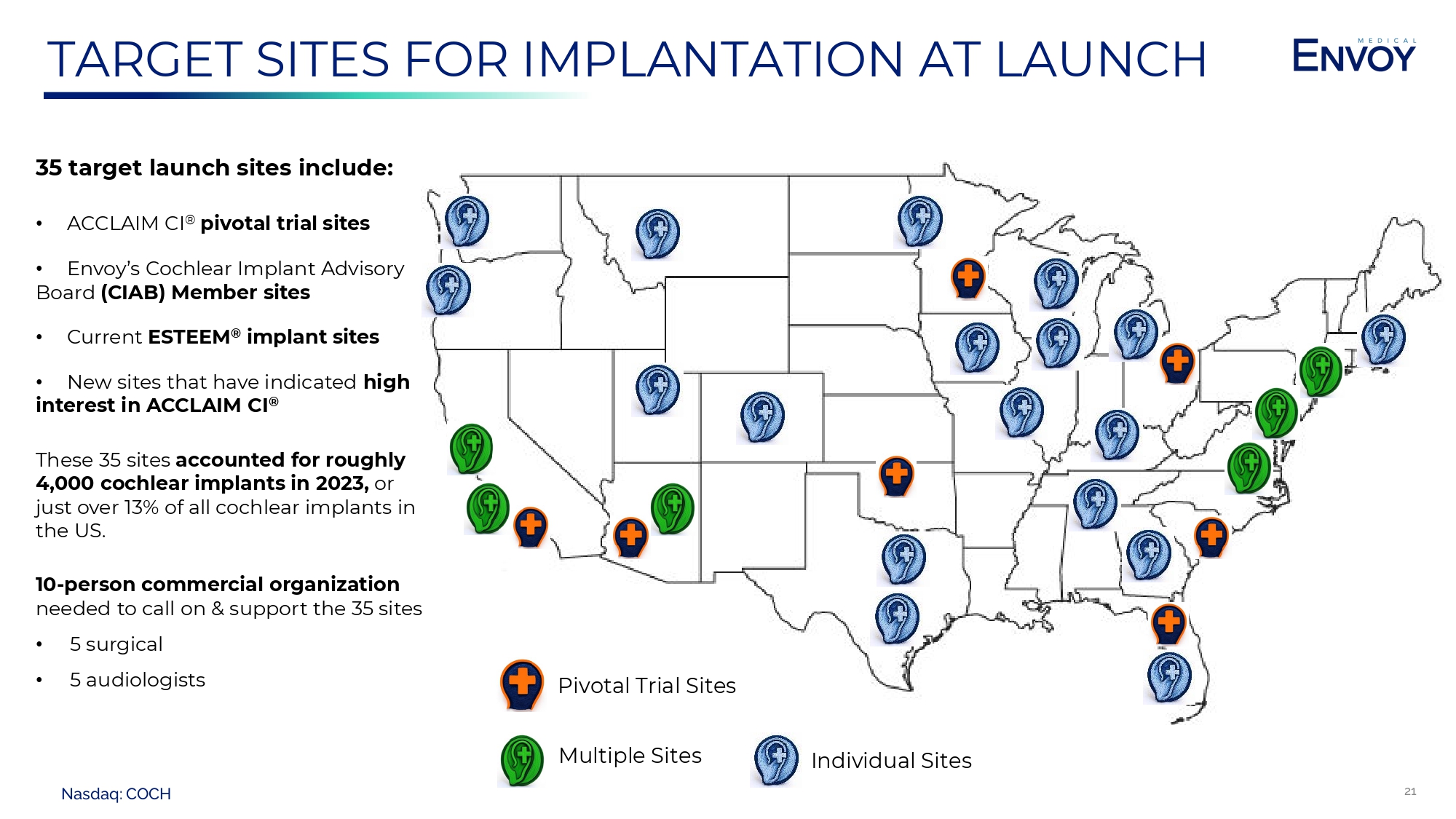 Nasdaq: COCH 21 TARGET SITES FOR IMPLANTATION AT LAUNCH 35 target launch sites include: • ACCLAIM CI ® pivotal trial sites • Envoy’s Cochlear Implant Advisory Board (CIAB) Member sites • Current ESTEEM ® implant sites • New sites that have indicated high interest in ACCLAIM CI ® These 35 sites accounted for roughly 4,000 cochlear implants in 2023, or just over 13% of all cochlear implants in the US . 10 - person commercial organization needed to call on & support the 35 sites • 5 surgical • 5 audiologists Multiple Sites Individual Sites Pivotal Trial Sites