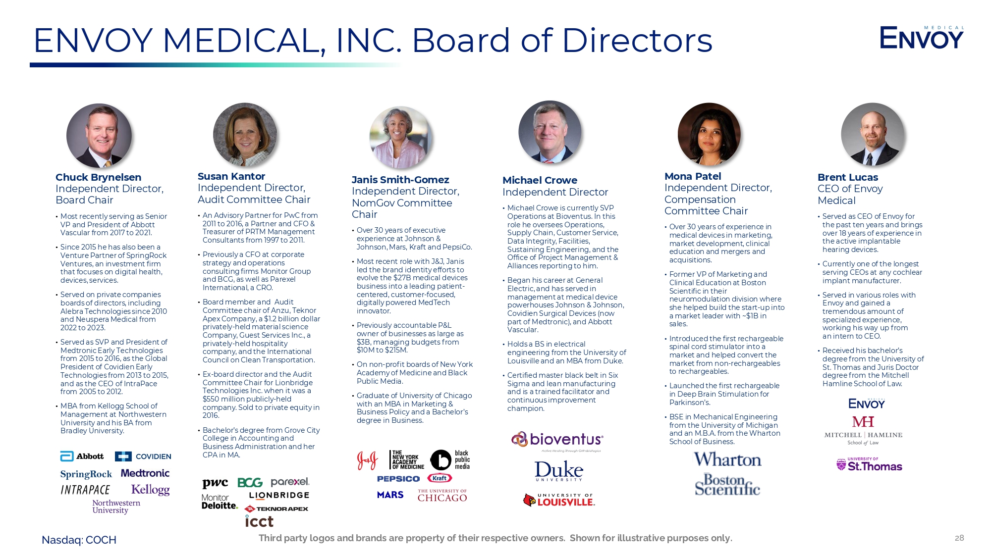 Nasdaq: COCH ENVOY MEDICAL, INC. Board of Directors hƏȇǣɀ³ȅǣɎǝ ٮ JȒȅƺɿ XȇƳƺȵƺȇƳƺȇɎ(ǣȸƺƬɎȒȸً zȒȅJȒɮ !ȒȅȅǣɎɎƺƺ !ǝƏǣȸ ‡ …ɮƺȸ ב ɵƺƏȸɀȒǔƺɴƺƬɖɎǣɮƺ ƺɴȵƺȸǣƺȇƬƺƏɎhȒǝȇɀȒȇۭ hȒǝȇɀȒȇًxƏȸɀًkȸƏǔɎƏȇƳ¨ƺȵɀǣ!Ȓِ ‡ xȒɀɎȸƺƬƺȇɎȸȒǼƺɯǣɎǝhۭhًhƏȇǣɀ ǼƺƳɎǝƺƫȸƏȇƳǣƳƺȇɎǣɎɵƺǔǔȒȸɎɀɎȒ ƺɮȒǼɮƺɎǝƺڟ או ȅƺƳǣƬƏǼƳƺɮǣƬƺɀ ƫɖɀǣȇƺɀɀǣȇɎȒƏǼƺƏƳǣȇǕȵƏɎǣƺȇɎ ٮ ƬƺȇɎƺȸƺƳًƬɖɀɎȒȅƺȸ ٮ ǔȒƬɖɀƺƳً ƳǣǕǣɎƏǼǼɵȵȒɯƺȸƺƳxƺƳÁƺƬǝ ǣȇȇȒɮƏɎȒȸِ ‡ ¨ȸƺɮǣȒɖɀǼɵƏƬƬȒɖȇɎƏƫǼƺ¨ۭn ȒɯȇƺȸȒǔƫɖɀǣȇƺɀɀƺɀƏɀǼƏȸǕƺƏɀ ڟ ב ًȅƏȇƏǕǣȇǕƫɖƳǕƺɎɀǔȸȒȅ ڟ xɎȒڟ אד xِ ‡ …ȇȇȒȇ ٮ ȵȸȒˡɎƫȒƏȸƳɀȒǔzƺɯçȒȸǸ ƬƏƳƺȅɵȒǔxƺƳǣƬǣȇƺƏȇƳ ǼƏƬǸ ¨ɖƫǼǣƬxƺƳǣƏِ ‡ JȸƏƳɖƏɎƺȒǔÈȇǣɮƺȸɀǣɎɵȒǔ!ǝǣƬƏǕȒ ɯǣɎǝƏȇx ǣȇxƏȸǸƺɎǣȇǕۭ ɖɀǣȇƺɀɀ¨ȒǼǣƬɵƏȇƳƏ ƏƬǝƺǼȒȸ ټ ɀ ƳƺǕȸƺƺǣȇ ɖɀǣȇƺɀɀِ Susan Kantor Independent Director, Audit Committee Chair • An Advisory Partner for PwC from 2011 to 2016, a Partner and CFO & Treasurer of PRTM Management Consultants from 1997 to 2011. • Previously a CFO at corporate strategy and operations consulting firms Monitor Group and BCG, as well as Parexel International, a CRO. • Board member and Audit Committee chair of Anzu, Teknor Apex Company, a $1.2 billion dollar privately - held material science Company, Guest Services Inc., a privately - held hospitality company, and the International Council on Clean Transportation. • Ex - board director and the Audit Committee Chair for Lionbridge Technologies Inc. when it was a $550 million publicly - held company. Sold to private equity in 2016. • Bachelor’s degree from Grove City College in Accounting and Business Administration and her CPA in MA. Mona Patel Independent Director, Compensation Committee Chair • Over 30 years of experience in medical devices in marketing, market development, clinical education and mergers and acquisitions. • Former VP of Marketing and Clinical Education at Boston Scientific in their neuromodulation division where she helped build the start - up into a market leader with ~$1B in sales. • Introduced the first rechargeable spinal cord stimulator into a market and helped convert the market from non - rechargeables to rechargeables. • Launched the first rechargeable in Deep Brain Stimulation for Parkinson’s. • BSE in Mechanical Engineering from the University of Michigan and an M.B.A. from the Wharton School of Business. Michael Crowe Independent Director • Michael Crowe is currently SVP Operations at Bioventus. In this role he oversees Operations, Supply Chain, Customer Service, Data Integrity, Facilities, Sustaining Engineering, and the Office of Project Management & Alliances reporting to him. • Began his career at General Electric, and has served in management at medical device powerhouses Johnson & Johnson, Covidien Surgical Devices (now part of Medtronic), and Abbott Vascular. • Holds a BS in electrical engineering from the University of Louisville and an MBA from Duke. • Certified master black belt in Six Sigma and lean manufacturing and is a trained facilitator and continuous improvement champion. Brent Lucas CEO of Envoy Medical • Served as CEO of Envoy for the past ten years and brings over 18 years of experience in the active implantable hearing devices. • Currently one of the longest serving CEOs at any cochlear implant manufacturer. • Served in various roles with Envoy and gained a tremendous amount of specialized experience, working his way up from an intern to CEO. • Received his bachelor’s degree from the University of St. Thomas and Juris Doctor degree from the Mitchell Hamline School of Law. Chuck Brynelsen Independent Director, Board Chair • Most recently serving as Senior VP and President of Abbott Vascular from 2017 to 2021. • Since 2015 he has also been a Venture Partner of SpringRock Ventures, an investment firm that focuses on digital health, devices, services. • Served on private companies boards of directors, including Alebra Technologies since 2010 and Neuspera Medical from 2022 to 2023. • Served as SVP and President of Medtronic Early Technologies from 2015 to 2016, as the Global President of Covidien Early Technologies from 2013 to 2015, and as the CEO of IntraPace from 2005 to 2012. • MBA from Kellogg School of Management at Northwestern University and his BA from Bradley University. 28 Third party logos and brands are property of their respective owners. Shown for illustrative purposes only.