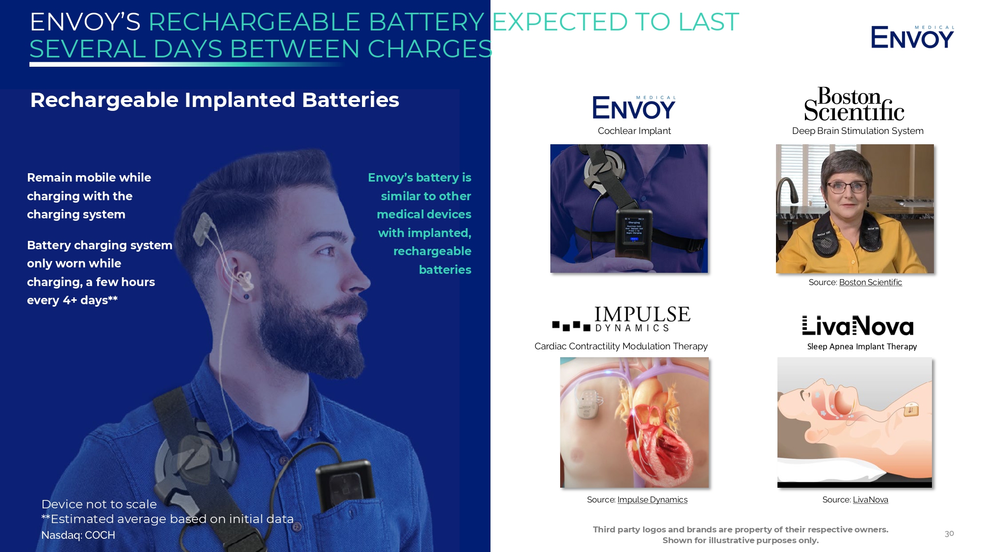 Nasdaq: COCH 30 ENVOY’S RECHARGEABLE BATTERY EXPECTED TO LAST SEVERAL DAYS BETWEEN CHARGES Remain mobile while charging with the charging system Battery charging system only worn while charging, a few hours every 4+ days** 0ȇɮȒɵ ټ ɀ ƫƏɎɎƺȸɵǣɀ ɀǣȅǣǼƏȸɎȒȒɎǝƺȸ ȅƺƳǣƬƏǼƳƺɮǣƬƺɀ ɯǣɎǝǣȅȵǼƏȇɎƺƳً ȸƺƬǝƏȸǕƺƏƫǼƺ ƫƏɎɎƺȸǣƺɀ Rechargeable Implanted Batteries Source: Boston Scientific Deep Brain Stimulation System Sleep Apnea Implant Therapy Source: LivaNova Source: Impulse Dynamics Cochlear Implant åƂĈijåā΅ ŜœƖƂåāƖijʼnijƖƼ΅ i ŜĈƞʼnåƖijŜœ΅ ¯ ĮĎƂåſƼ Third party logos and brands are property of their respective owners. Shown for illustrative purposes only. Device not to scale **Estimated average based on initial data