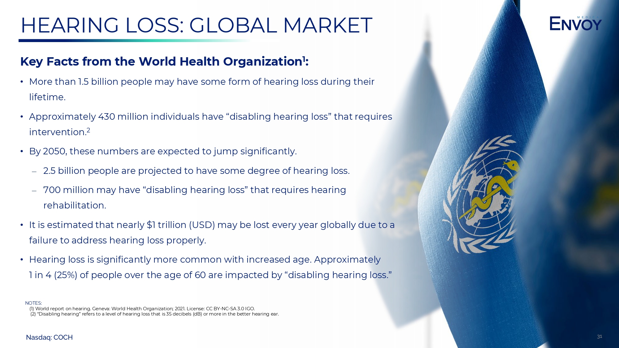 Nasdaq: COCH 31 HEARING LOSS: GLOBAL MARKET Key Facts from the World Health Organization 1 : • More than 1.5 billion people may have some form of hearing loss during their lifetime. • Approximately 430 million individuals have “disabling hearing loss” that requires intervention. 2 • By 2050, these numbers are expected to jump significantly. ⎼ 2.5 billion people are projected to have some degree of hearing loss. ⎼ 700 million may have “disabling hearing loss” that requires hearing rehabilitation. • It is estimated that nearly $1 trillion (USD) may be lost every year globally due to a failure to address hearing loss properly. • Hearing loss is significantly more common with increased age. Approximately 1 in 4 (25%) of people over the age of 60 are impacted by “disabling hearing loss.” NOTES: (1) (1) World report on hearing. Geneva: World Health Organization; 2021. License: CC BY - NC - SA 3.0 IGO. (2) (2) “Disabling hearing” refers to a level of hearing loss that is 35 decibels (dB) or more in the better hearing ear.