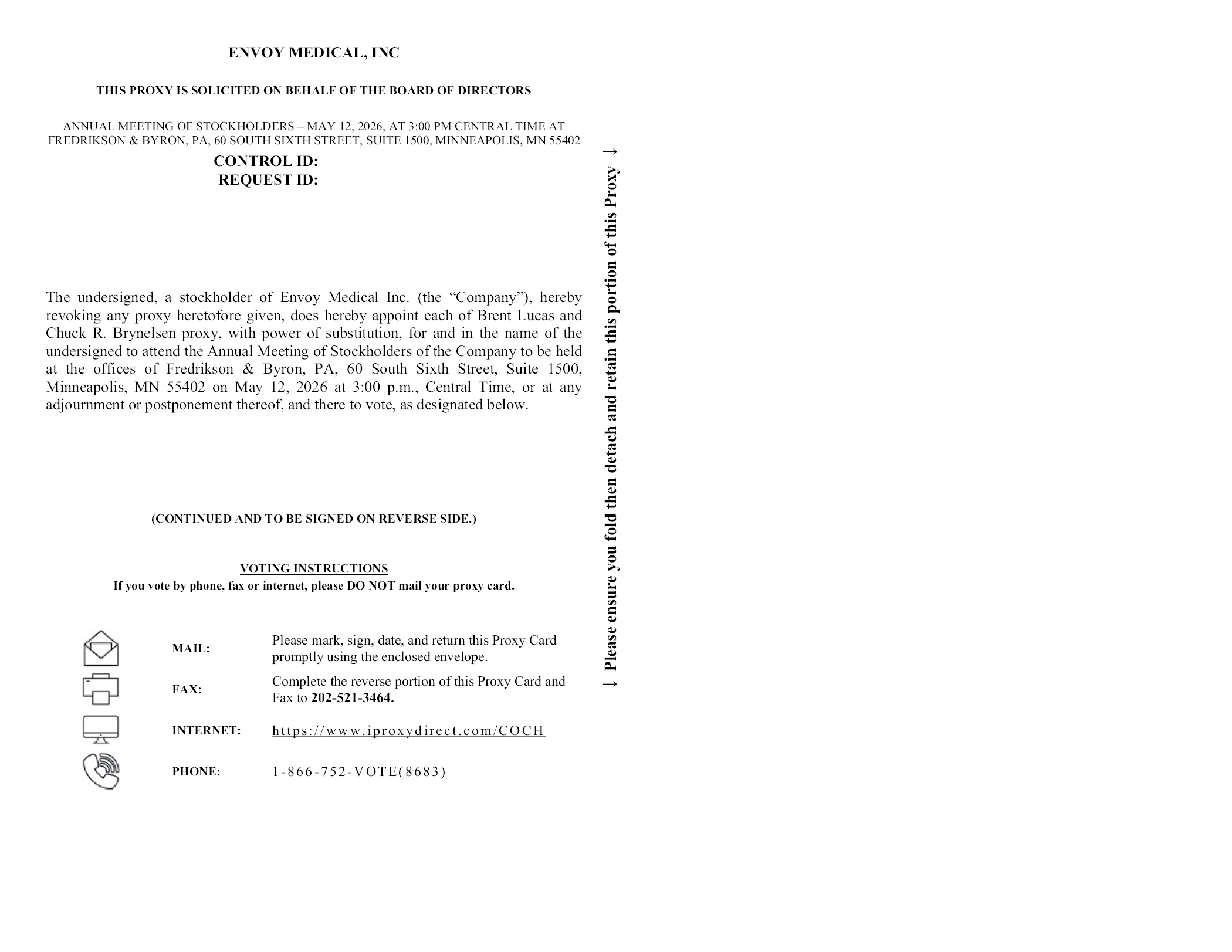 ENVOY MEDICAL, INC THIS PROXY IS SOLICITED ON BEHALF OF THE BOARD OF DIRECTORS Please ensure you fold then detach and retain this portion of this Proxy ANNUAL MEETING OF STOCKHOLDERS – MAY 12, 2026, AT 3:00 PM CENTRAL TIME AT FREDRIKSON & BYRON, PA, 60 SOUTH SIXTH STREET, SUITE 1500, MINNEAPOLIS, MN 55402 CONTROL ID: REQUEST ID: The undersigned, a stockholder of Envoy Medical Inc. (the “Company”), hereby revoking any proxy heretofore given, does hereby appoint each of Brent Lucas and Chuck R. Brynelsen proxy, with power of substitution, for and in the name of the undersigned to attend the Annual Meeting of Stockholders of the Company to be held at the offices of Fredrikson & Byron, PA, 60 South Sixth Street, Suite 1500, Minneapolis, MN 55402 on May 12, 2026 at 3:00 p.m., Central Time, or at any adjournment or postponement thereof, and there to vote, as designated below. (CONTINUED AND TO BE SIGNED ON REVERSE SIDE.) VOTING INSTRUCTIONS If you vote by phone, fax or internet, please DO NOT mail your proxy card. MAIL: Please mark, sign, date, and return this Proxy Card promptly using the enclosed envelope. FAX: Complete the reverse portion of this Proxy Card and Fax to 202-521-3464. INTERNET: https://www.iproxydirect.com/COCH PHONE: 1-866-752-VOTE(8683)