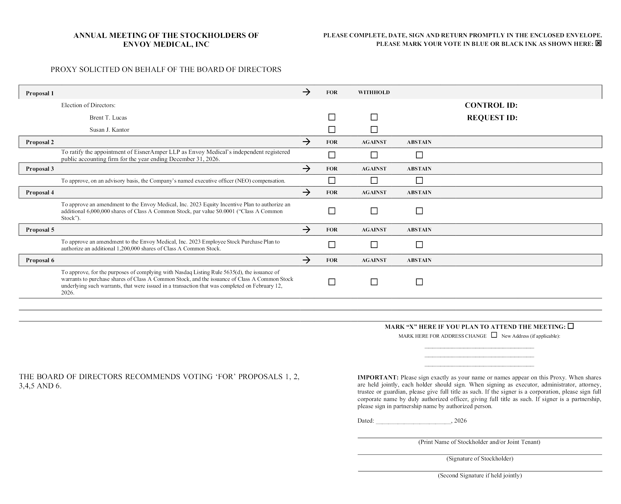 PLEASE MARK YOUR VOTE IN BLUE OR BLACK INK AS SHOWN HERE: PROXY SOLICITED ON BEHALF OF THE BOARD OF DIRECTORS Proposal 1 FOR WITHHOLD Election of Directors: CONTROL ID: Brent T. Lucas REQUEST ID: Susan J. Kantor Proposal 2 FOR AGAINST ABSTAIN To ratify the appointment of EisnerAmper LLP as Envoy Medical’s independent registered public accounting firm for the year ending December 31, 2026. Proposal 3 FOR AGAINST ABSTAIN To approve, on an advisory basis, the Company’s named executive officer (NEO) compensation. Proposal 4 FOR AGAINST ABSTAIN To approve an amendment to the Envoy Medical, Inc. 2023 Equity Incentive Plan to authorize an additional 6,000,000 shares of Class A Common Stock, par value $0.0001 (“Class A Common Stock”).. Proposal 5 FOR AGAINST ABSTAIN To approve an amendment to the Envoy Medical, Inc. 2023 Employee Stock Purchase Plan to authorize an additional 1,200,000 shares of Class A Common Stock. Proposal 6 FOR AGAINST ABSTAIN To approve, for the purposes of complying with Nasdaq Listing Rule 5635(d), the issuance of warrants to purchase shares of Class A Common Stock, and the issuance of Class A Common Stock underlying such warrants, that were issued in a transaction that was completed on February 12, 2026. MARK “X” HERE IF YOU PLAN TO ATTEND THE MEETING: THE BOARD OF DIRECTORS RECOMMENDS VOTING ‘FOR’ PROPOSALS 1, 2, 3,4,5 AND 6. MARK HERE FOR ADDRESS CHANGE New Address (if applicable): IMPORTANT: Please sign exactly as your name or names appear on this Proxy. When shares are held jointly, each holder should sign. When signing as executor, administrator, attorney, trustee or guardian, please give full title as such. If the signer is a corporation, please sign full corporate name by duly authorized officer, giving full title as such. If signer is a partnership, please sign in partnership name by authorized person. Dated:, 2026 (Print Name of Stockholder and/or Joint Tenant) (Signature of Stockholder) (Second Signature if held jointly)